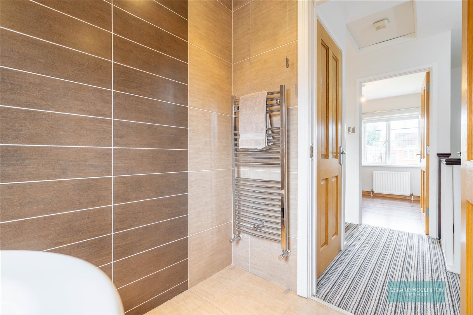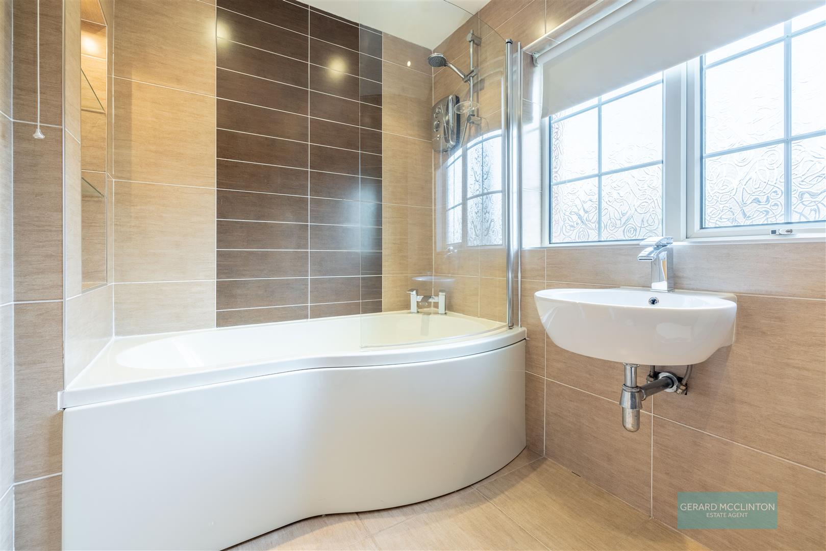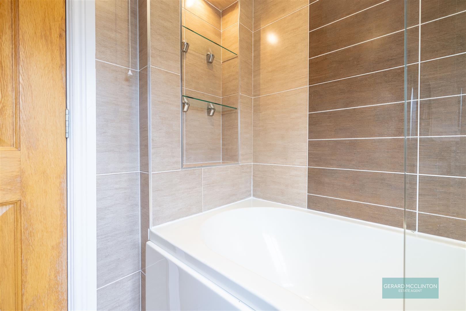 Tiled floor and walls, upvc double glazed window to rear, P shaped bath with contemporary mixer tap and Triton electric shower over, display area with glass shelving and lighting, floating bowl sink with contemporary mixer tap, close coupled wc, heated chrome towel rail, spotlights, extractor fan immersion heating switch.
