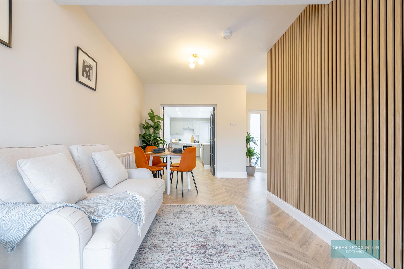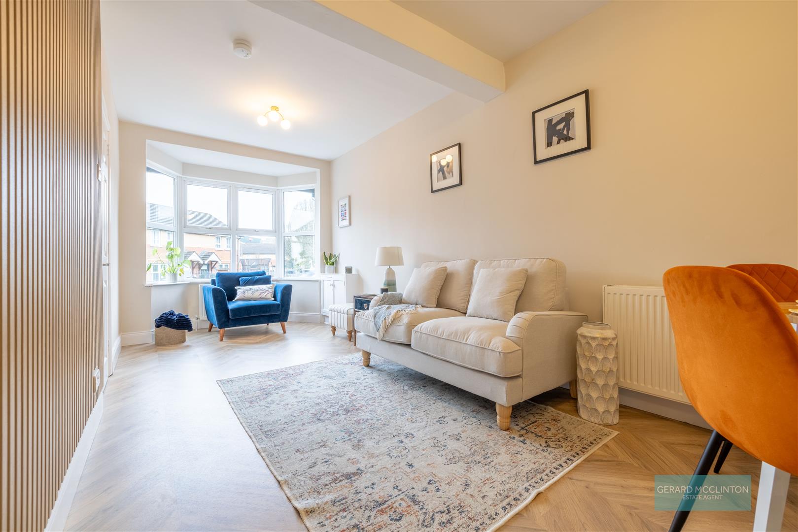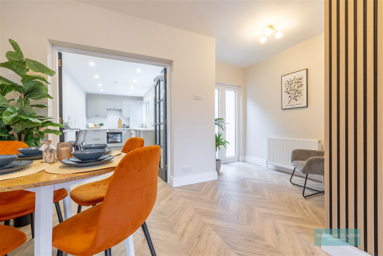 UPVC double glazed bay window to front, new Chevron style laminate wooden floor, newly installed fluted wood feature wall, new radiator, double doors onto kitchen