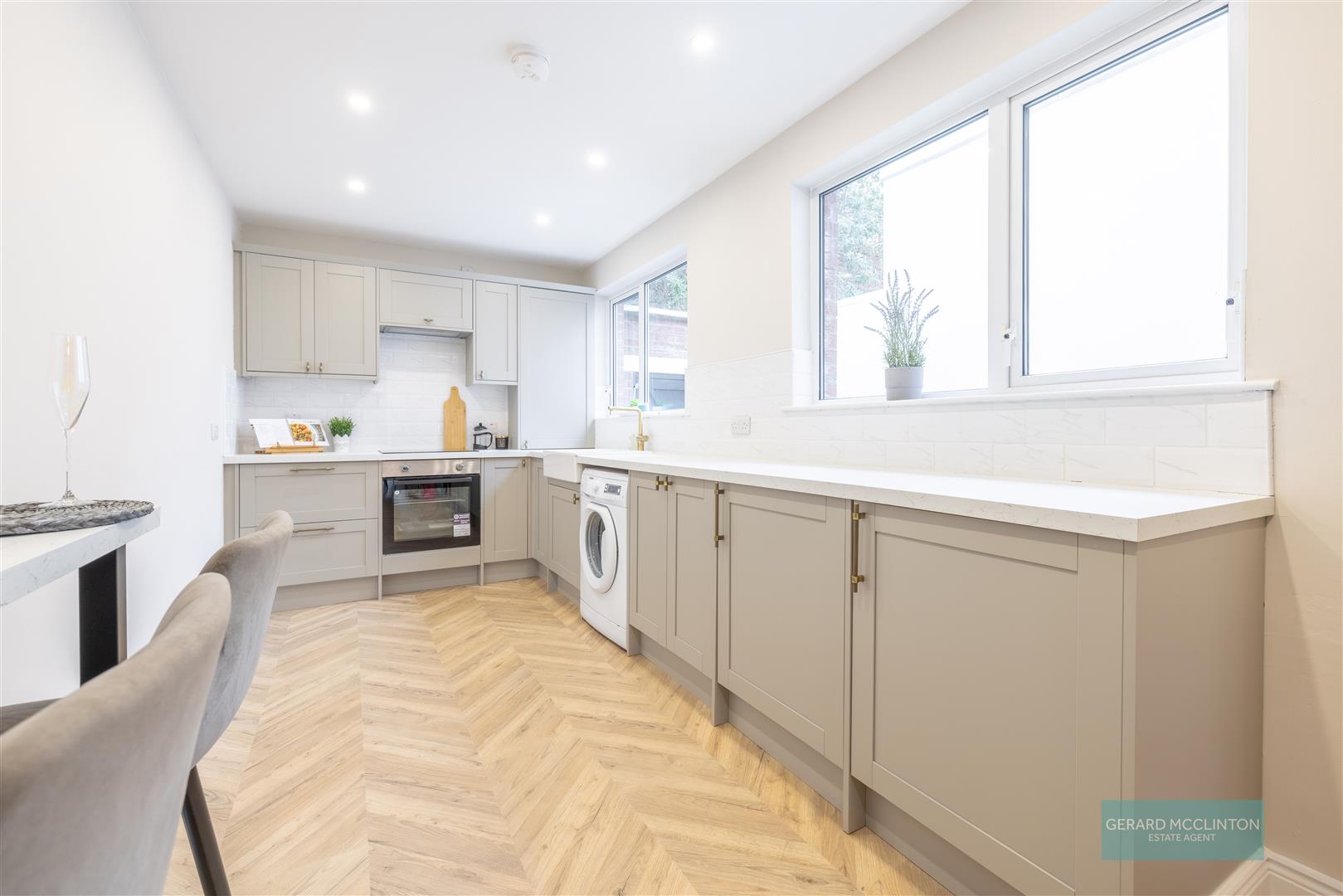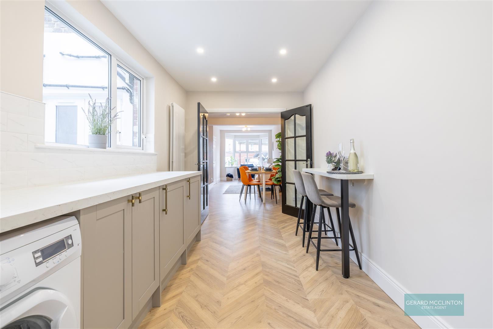 Black glazed double doors, newly layered Chevron style laminate wooden floor continues from the living space into the kitchen, brand-new fitted kitchen with shaker style units, and quart effect worktops, integrated electric oven, four ring hob with extractor over, integrated under counter fridge and separate freezer, space and plumbed for washing machine, modern style "Belfast" sink with bronze mixer tap, newly installed wall mounted gas fire central heating boiler, tiled walls, spotlights, breakfast bar area with usb A & C socket, contemporary vertical radiator