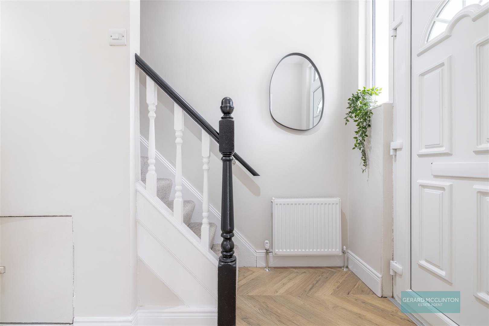 UPVC double glazed door to front, new radiator, new Chevron style laminate wooden floor, staircase to 1st floor