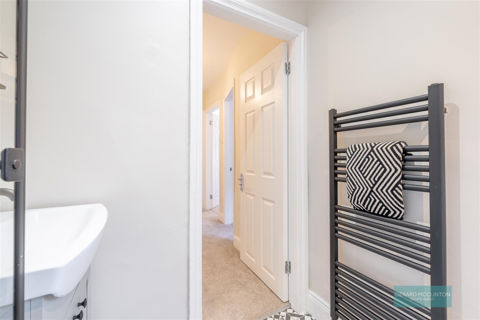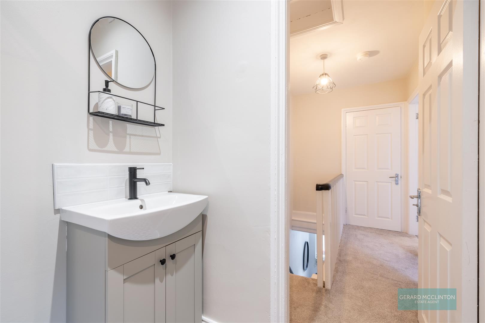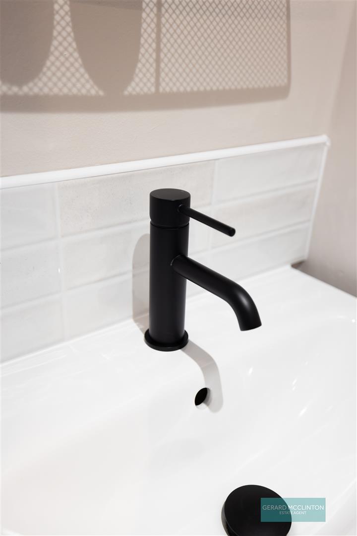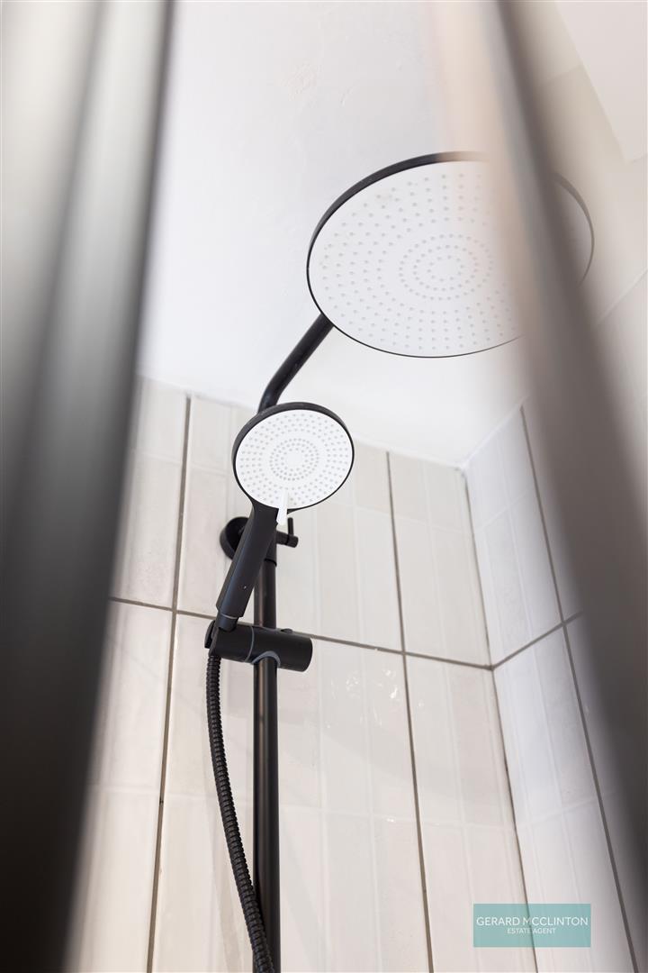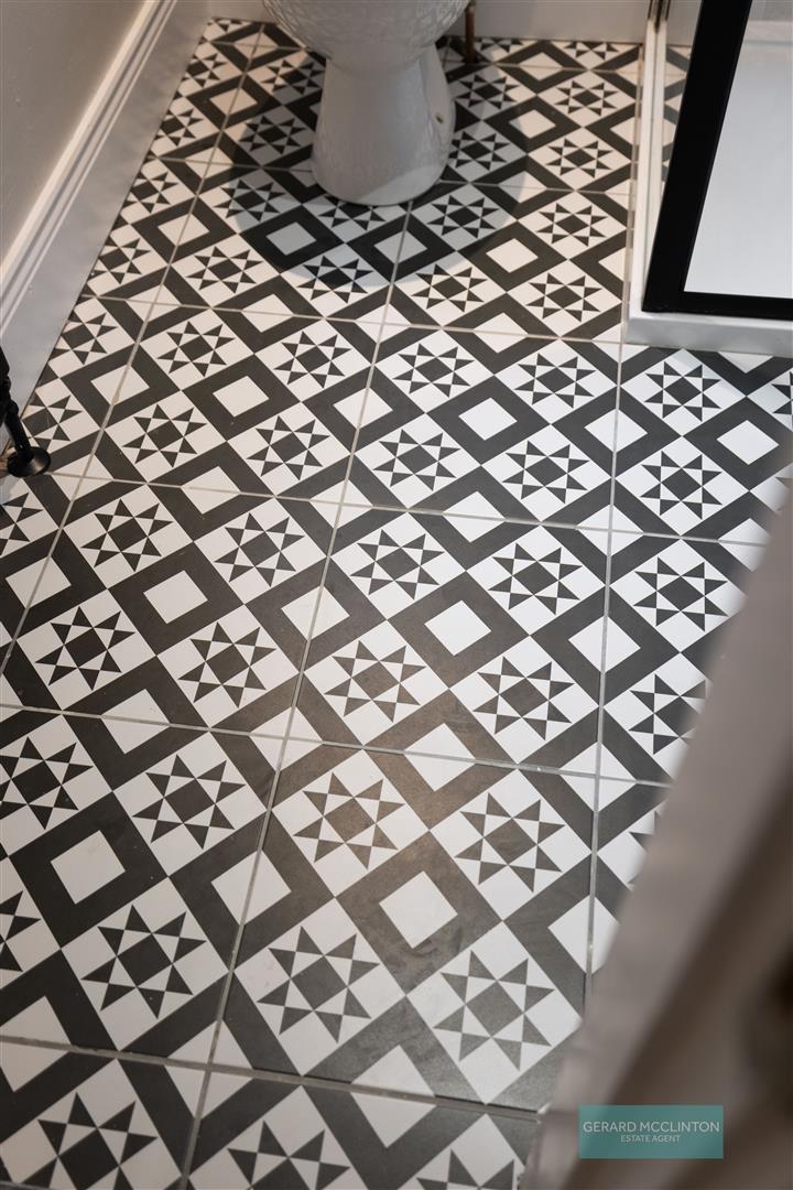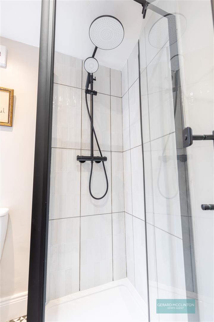 UPVC double Glazed window to side, new black-and-white tiled floor, spotlights, newly fitted suite comprising corner shower cubicle with matt black trim, matt black thermostatic shower with oversized rain style head and separate handheld shower. Wash hand basin with mat black mixer tap and vanity unit under and tiled splash back. Extractor fan. Matt black heated towel radiator.