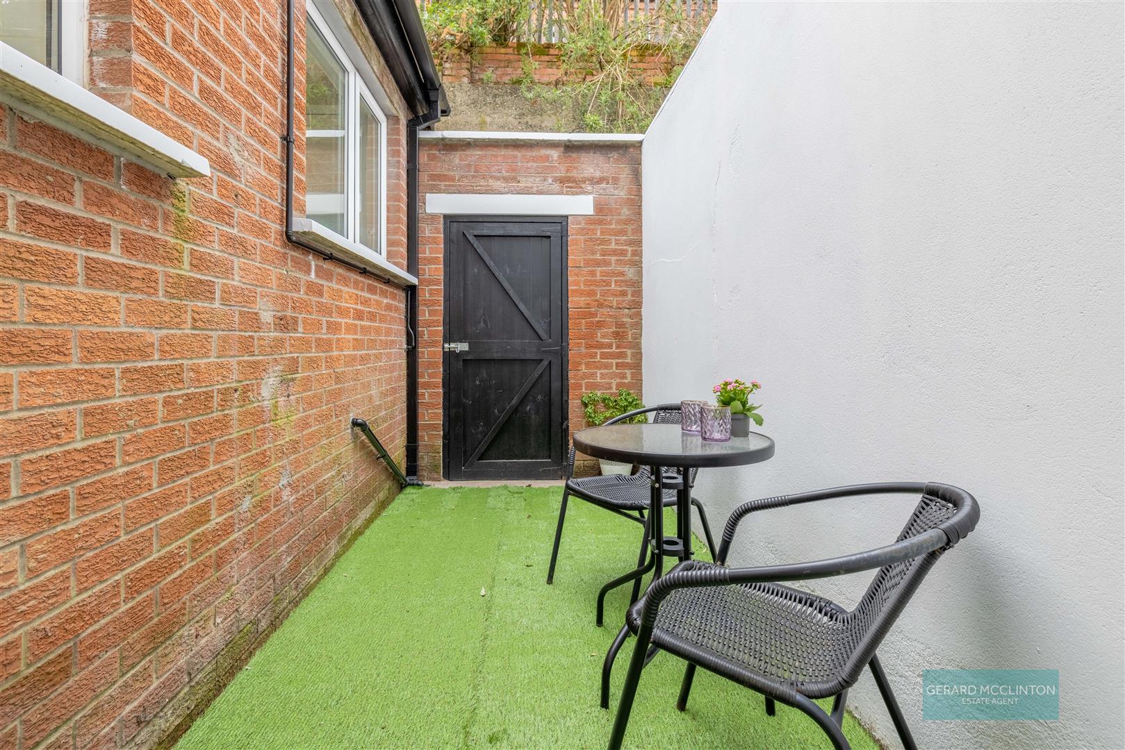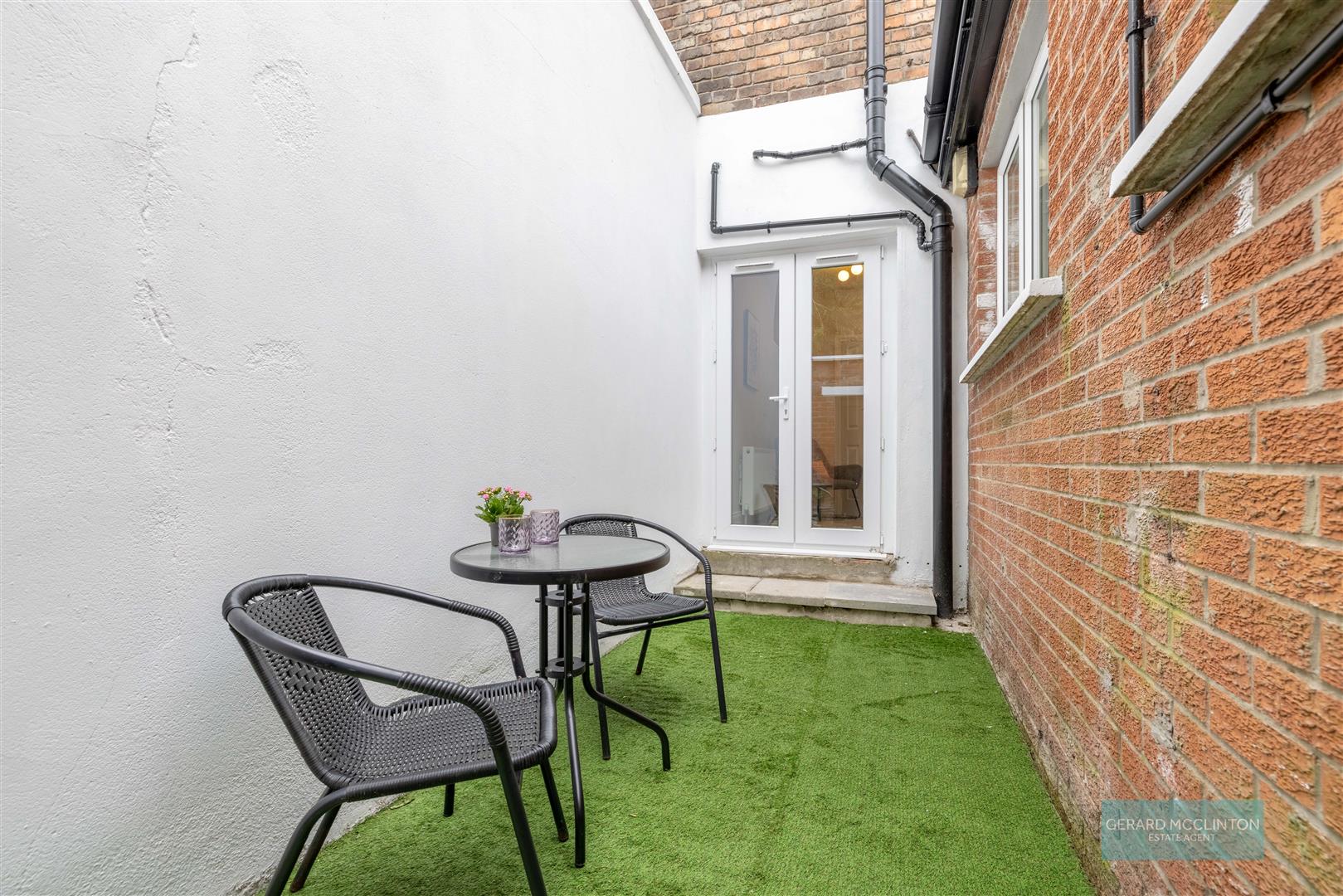 Newly fitted UPVC double glazed patio doors onto enclosed rear yard, newly painted external wall in crisp white and low maintenance artificial grass newly laid.