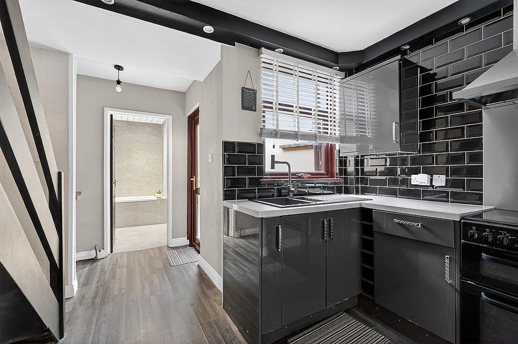 Kitchen – 3.41 × 3.95 (11'2" x 12'9") Open plan kitchen leading into bathroom. Fitted Kitchen with ample high and low-level units, oven, rear yard view window, and laminate flooring.