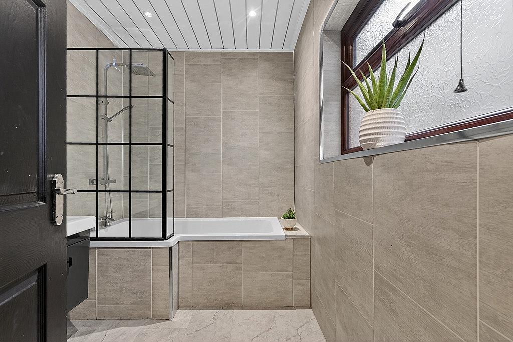 Bathroom – 1.88 × 2.39 (6'2" x 7'8") Fully tiled walls and floor, grey tiles, double-headed shower, wc, whb.