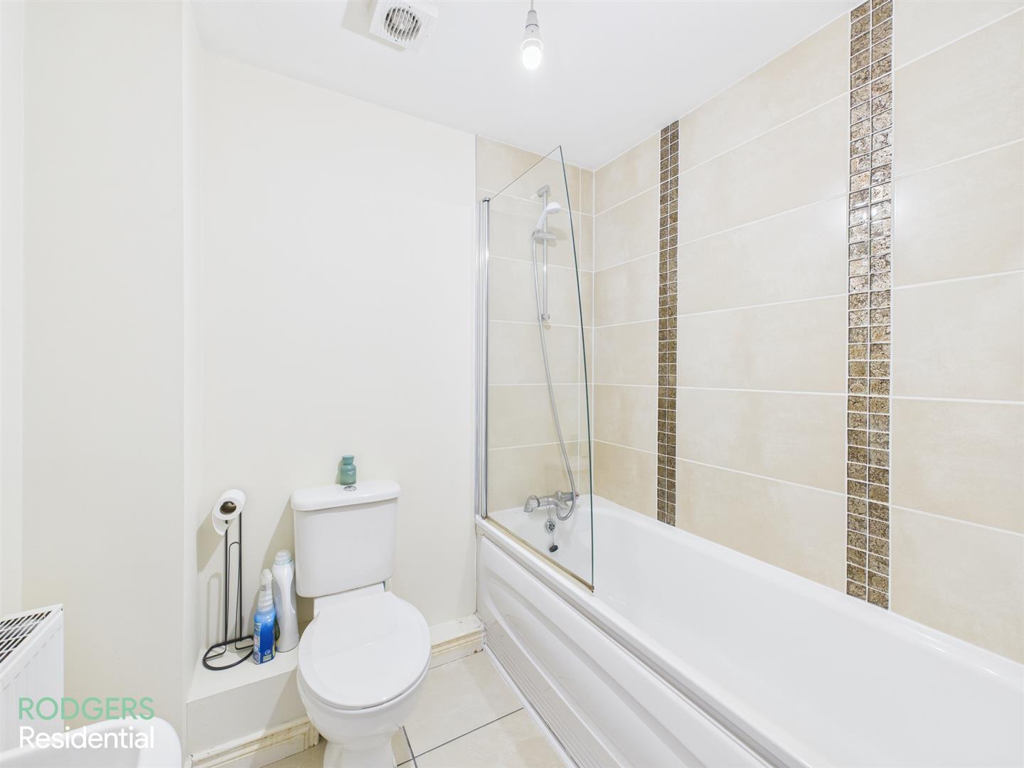 Pedestal Sink With Chrome Mixer Tap, Low Flush WC, Panelled Bathroom With Overhead Shower & Chrome Mixer Tap, Half Tiled Walls, Tiled Flooring, Extractor Fan