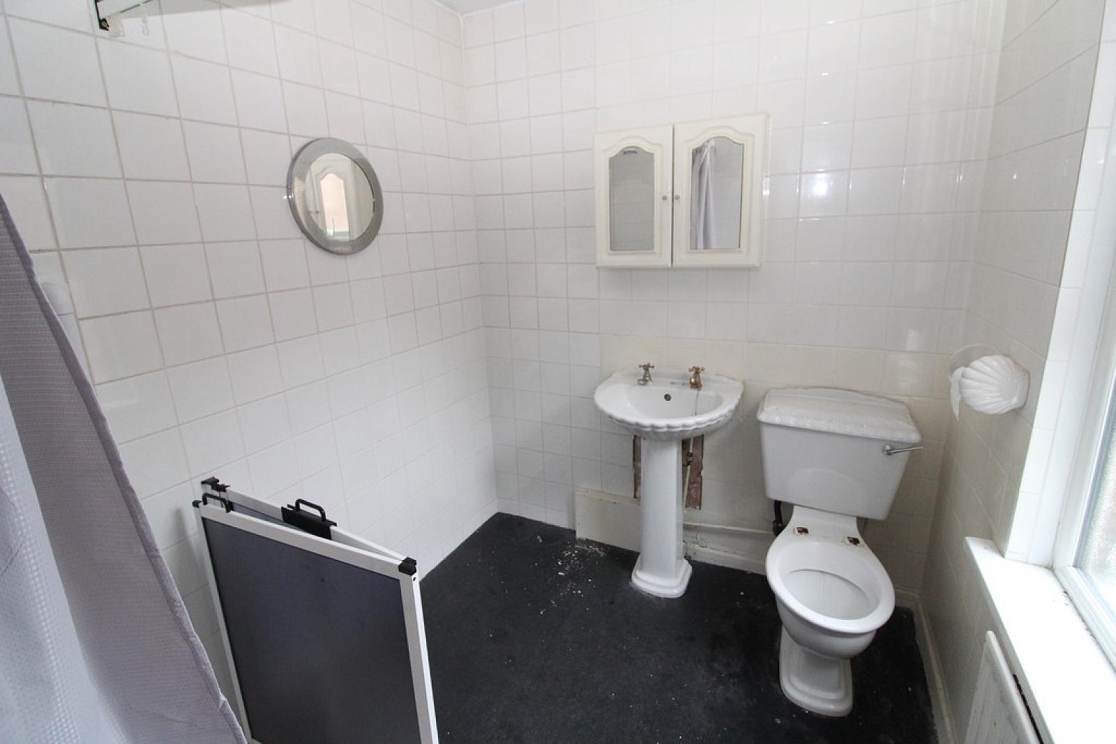SHOWER ROOM Electric shower, low flush W/C, pedestal wash hand basin, tiled walls, extractor fan
