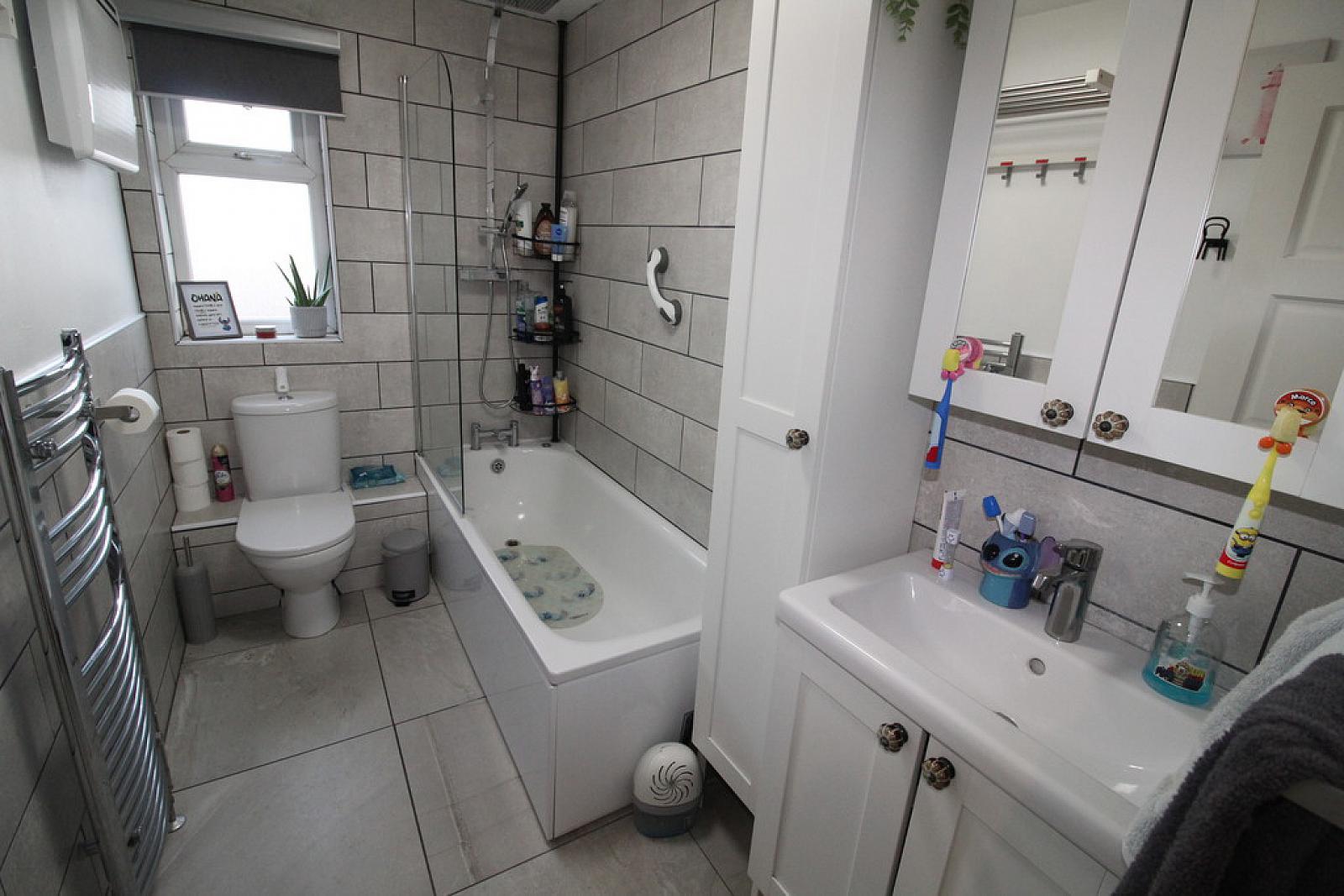 MODERN BATHROOM uPVC bath unit, rainwater effect shower head, glazed shower screen, vanity sink unit, low flush W/C, chrome heated towel rail, wall tiling and flooring