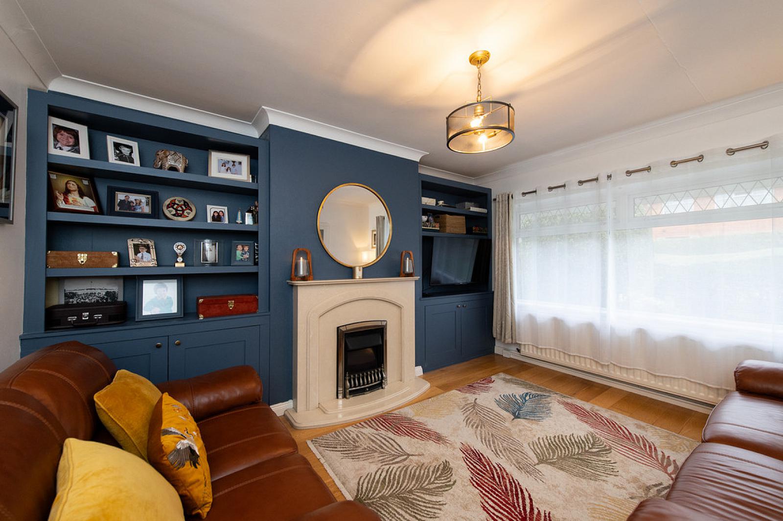 FAMILY ROOM 12' 0" x 8' 11" (3.66m x 2.72m) Laminate wood flooring, attractive feature fire, shelving
