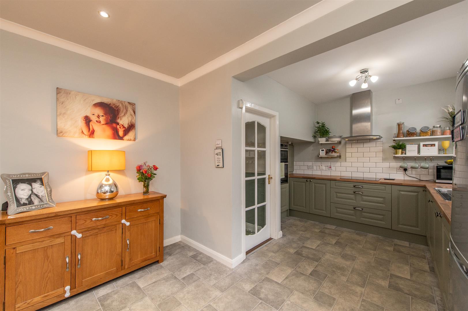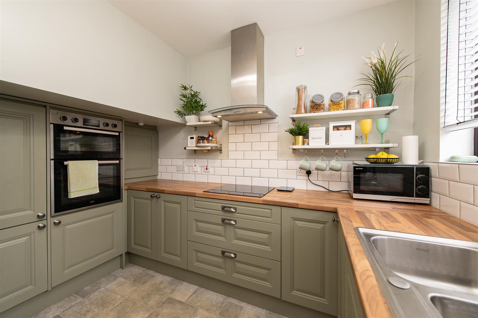 Shaker style fitted kitchen with a range of high and low level units, round edge work surfaces, single drainer stainless steel sink unit with mixer taps, built in stainless steel ovens, stainless steel extractor fan, inlaid hob, wall tiling, sliding doors to rear