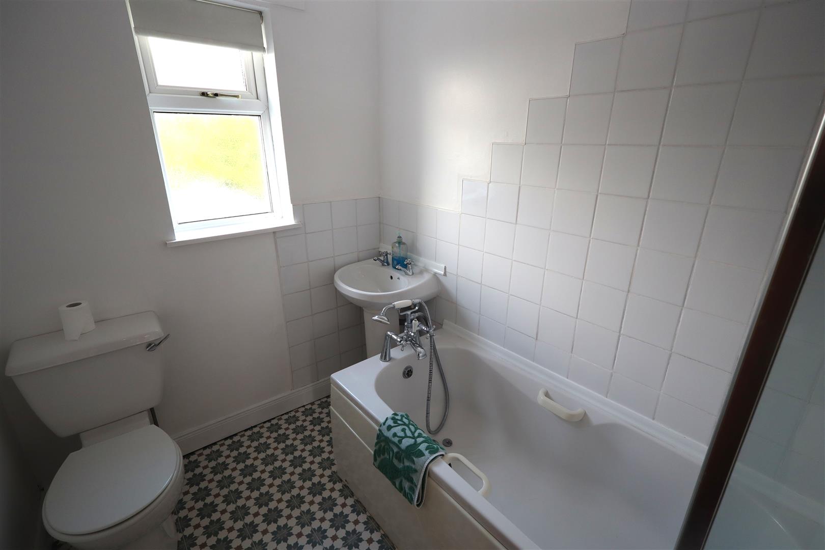 White suite. Panelled bath with mixer tap and telephone hand shower. Electric controlled shower with attachment. Pedestal wash hand basin. Low flush WC. Heated towel rail. Tiling. Extractor fan.