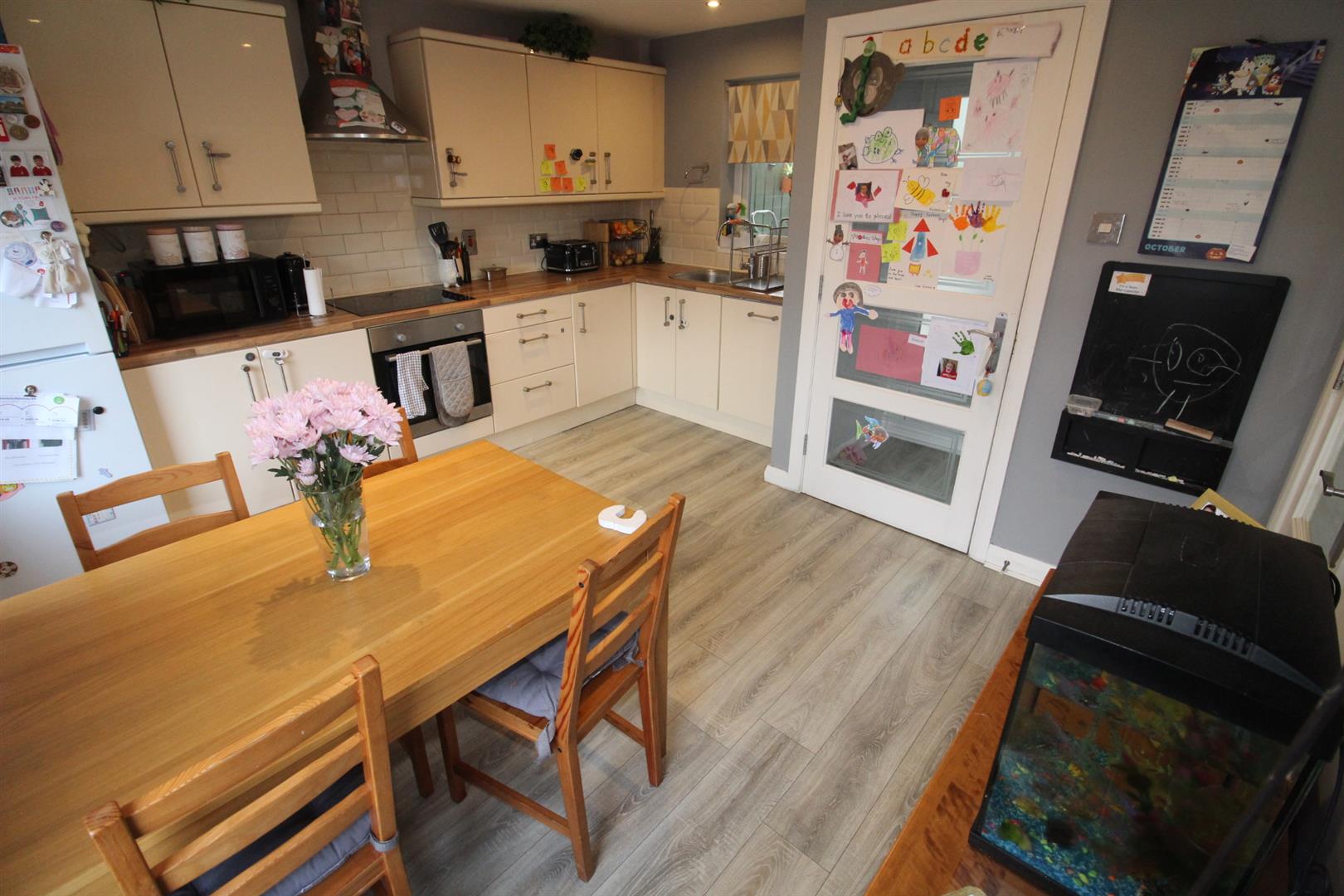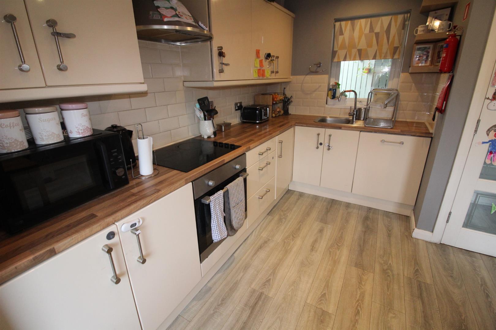 Range of high and low level units, round edge work surfaces, single drainer stainless steel sink unit, built in stainless steel oven, in laid hob, stainless steel extractor hood, built in dishwasher, space for fridge freezer, laminate wooden flooring, downlighters