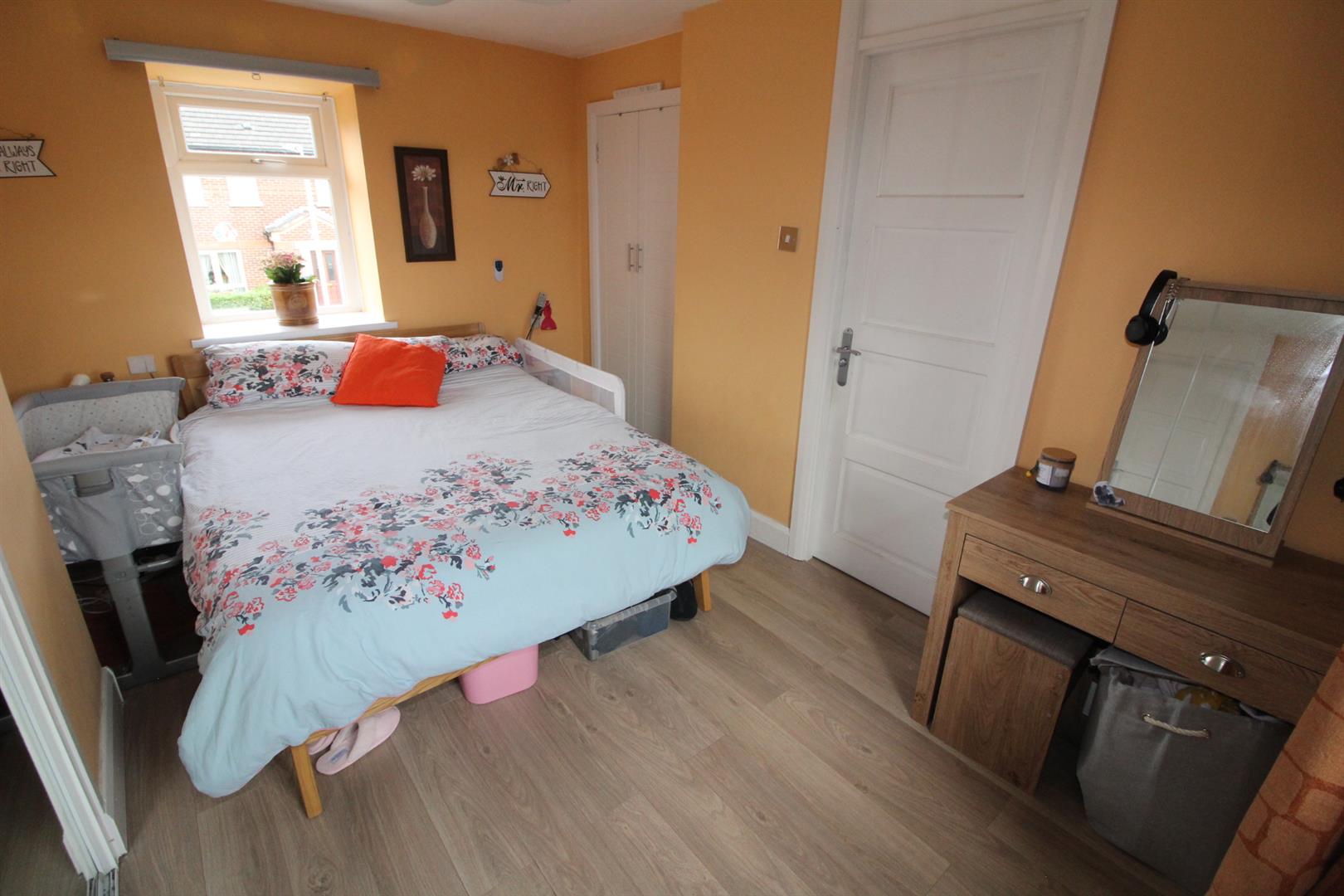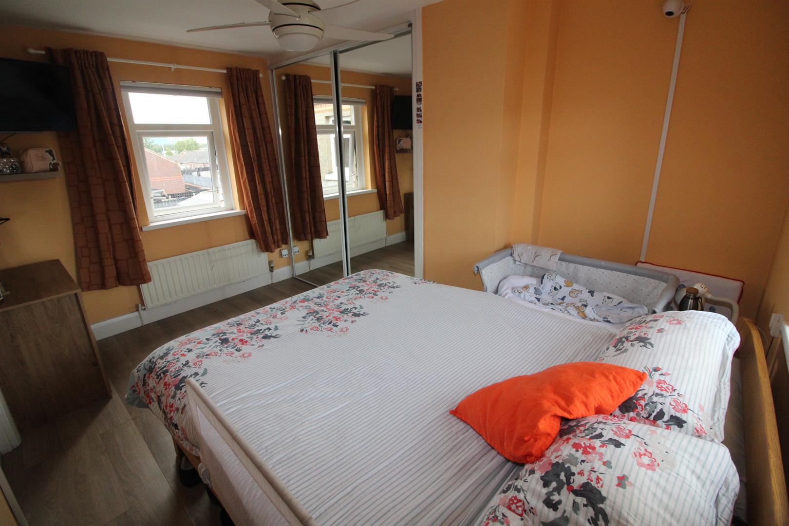 Laminate wooden flooring, built in slide robes, built in wardrobe