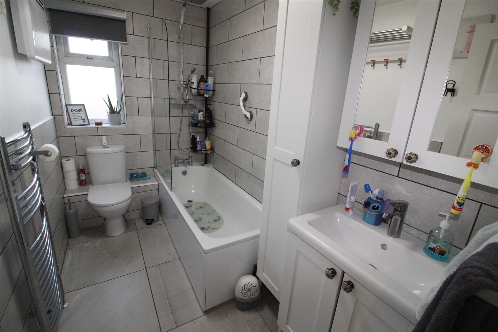 uPVC bath unit, rainwater effect shower head, glazed shower screen, vanity sink unit, low flush W/C, chrome heated towel rail, wall tiling and flooring