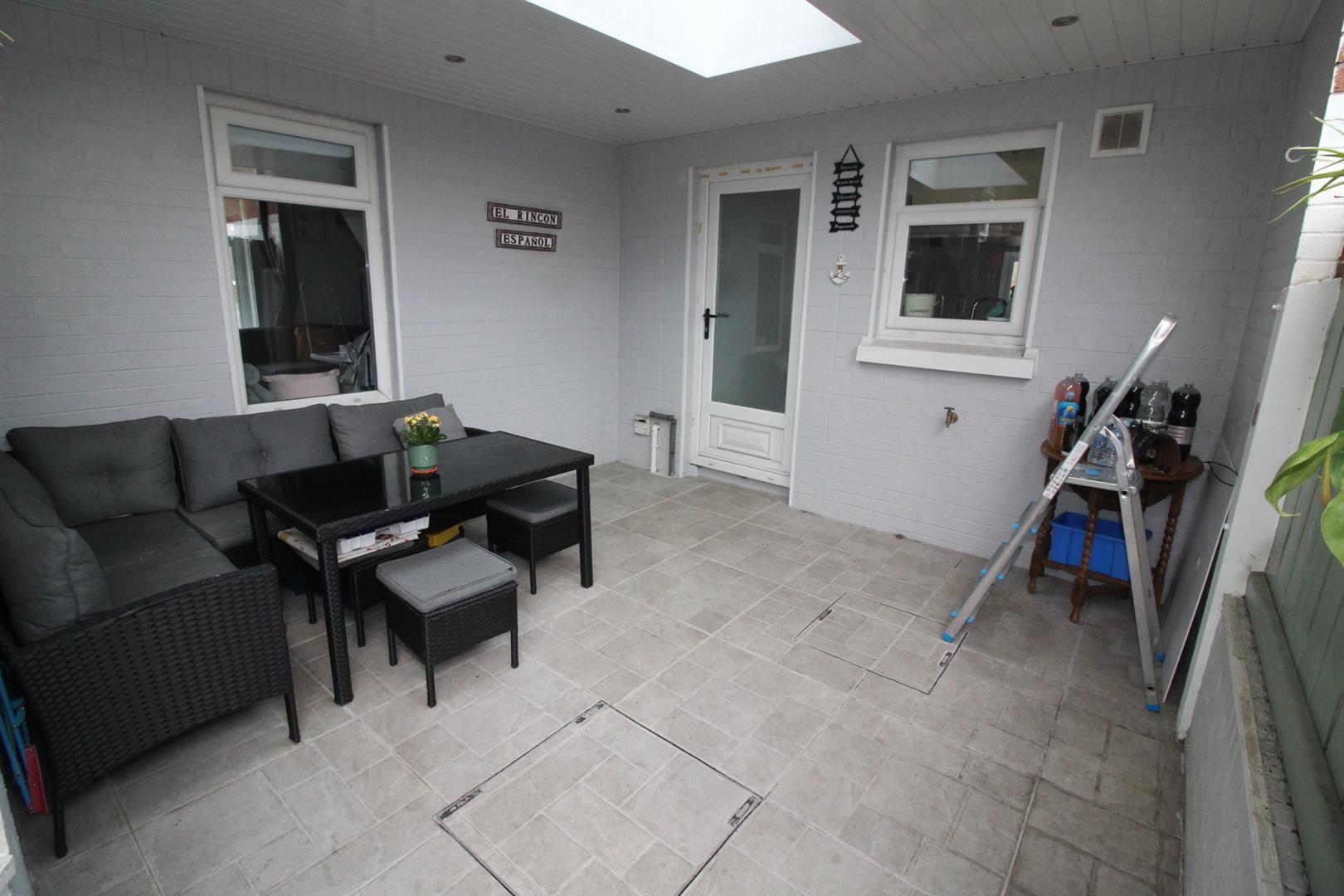 Rear: Covered paved patio area, uPVC ceiling, outside tap, outside lights