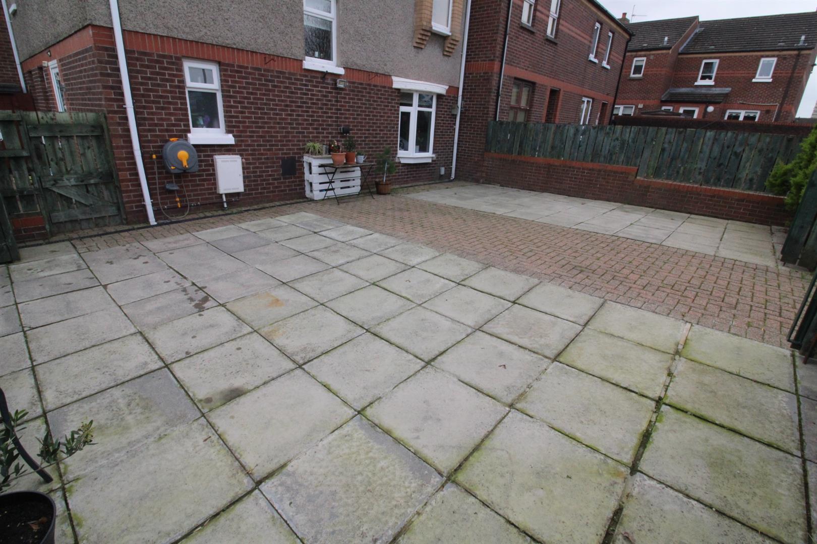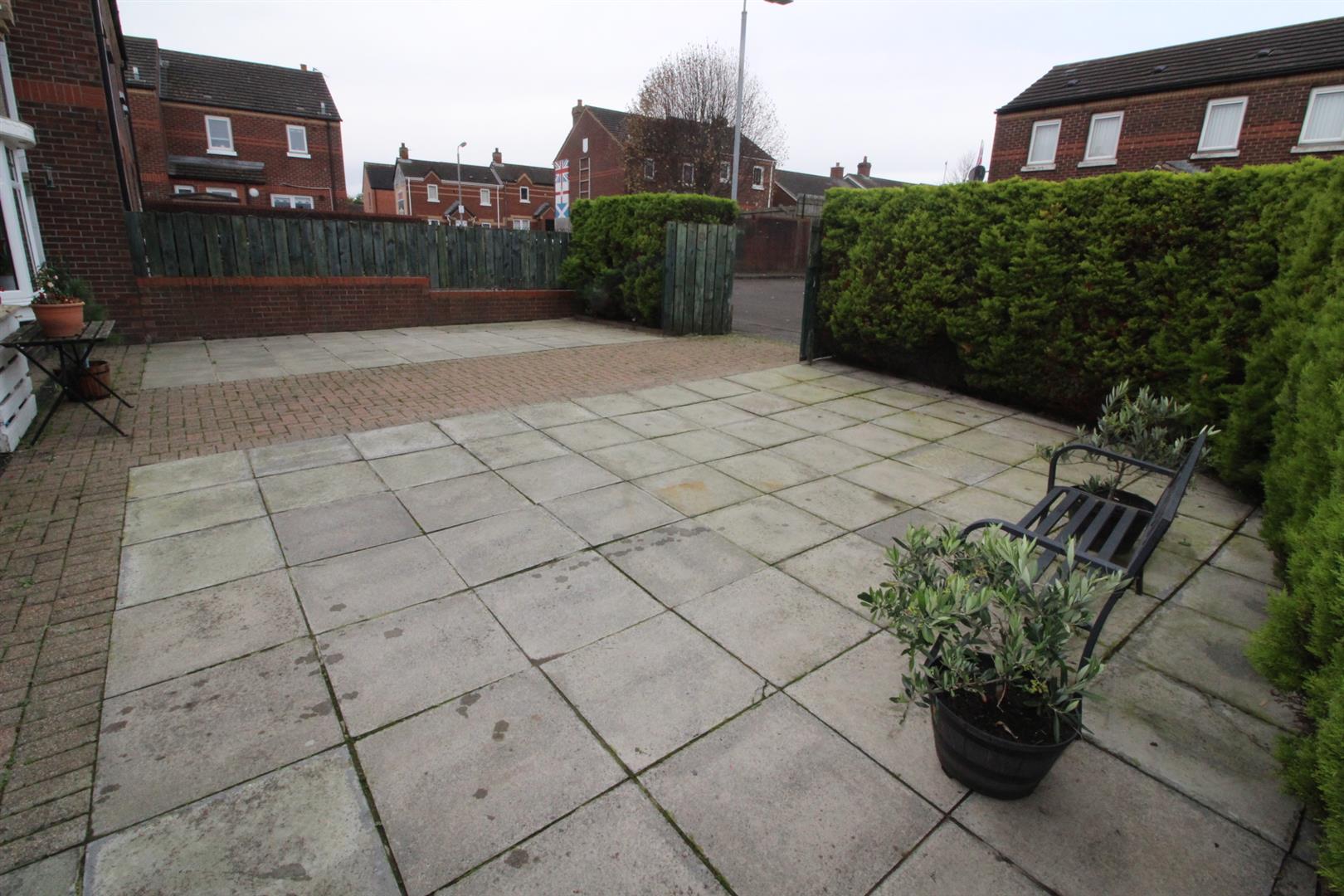 Side: Enclosed paved patio area, off road parking, outside tap, hedges
