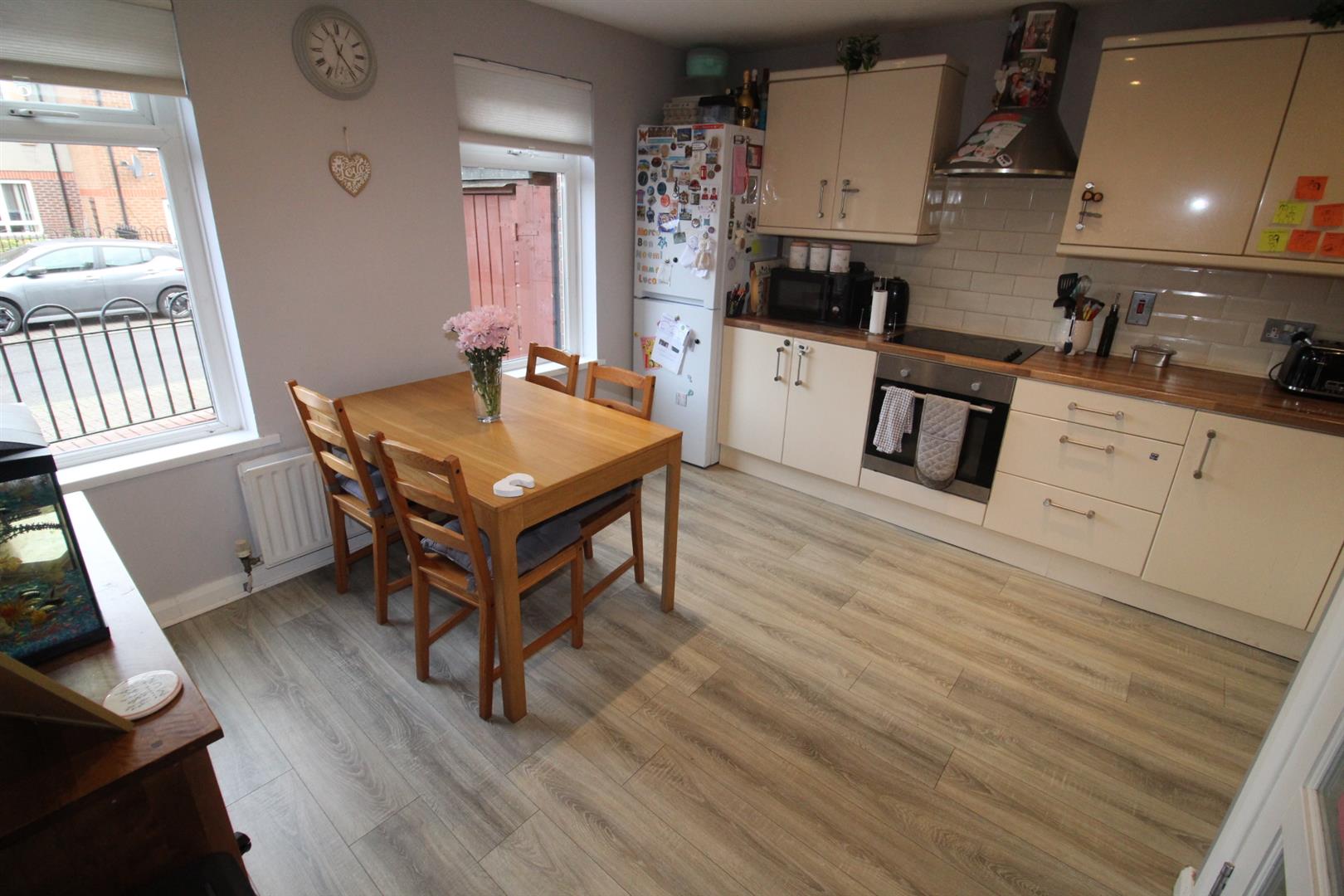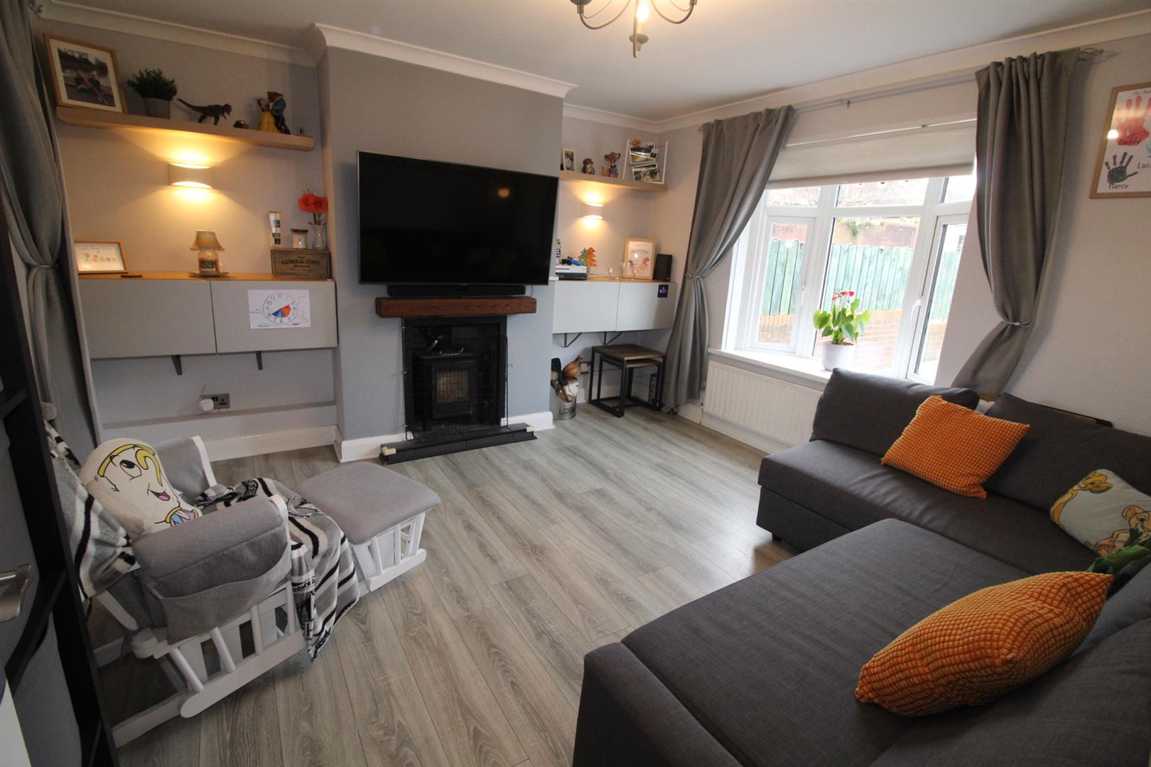 Laminate wooden flooring, feature wood burning stove, tiled hearth, cornicing