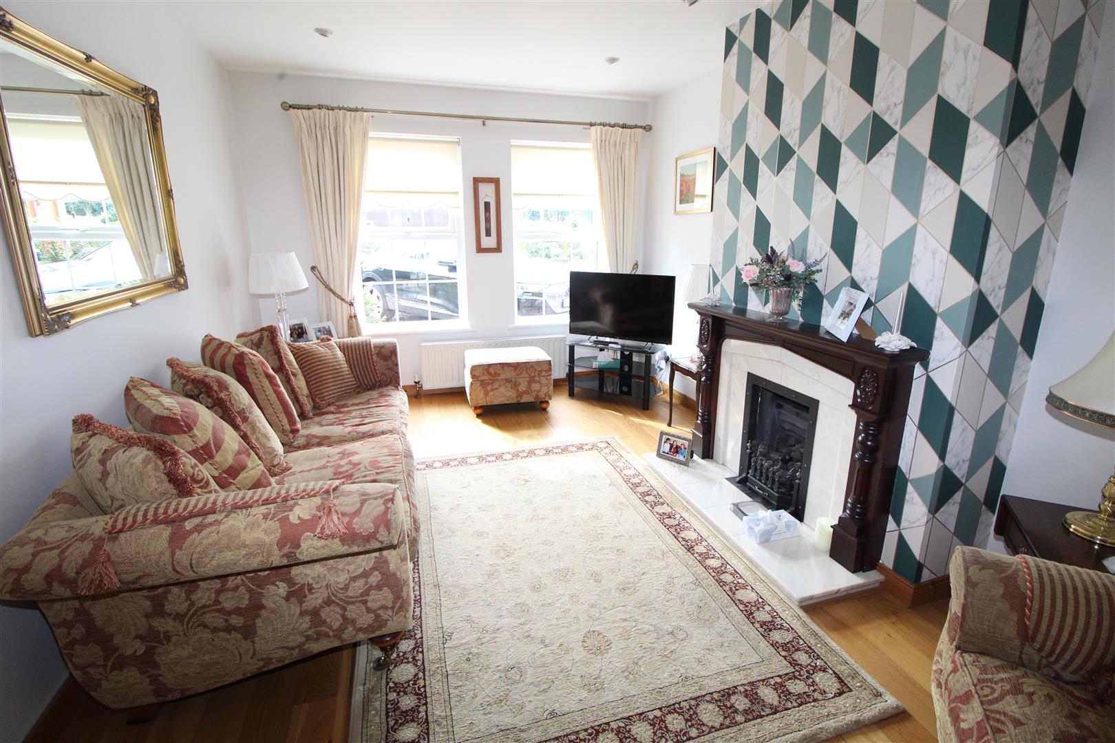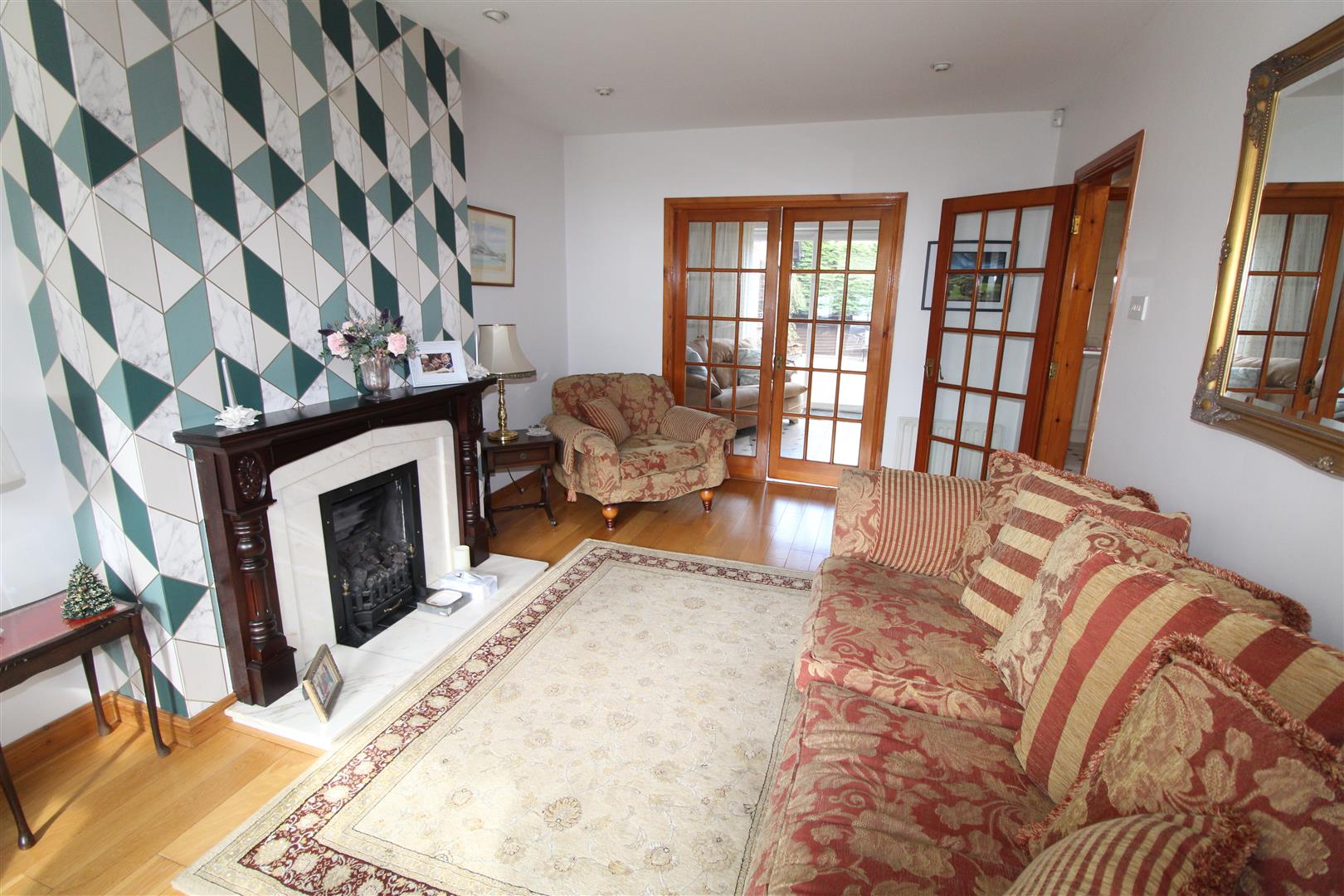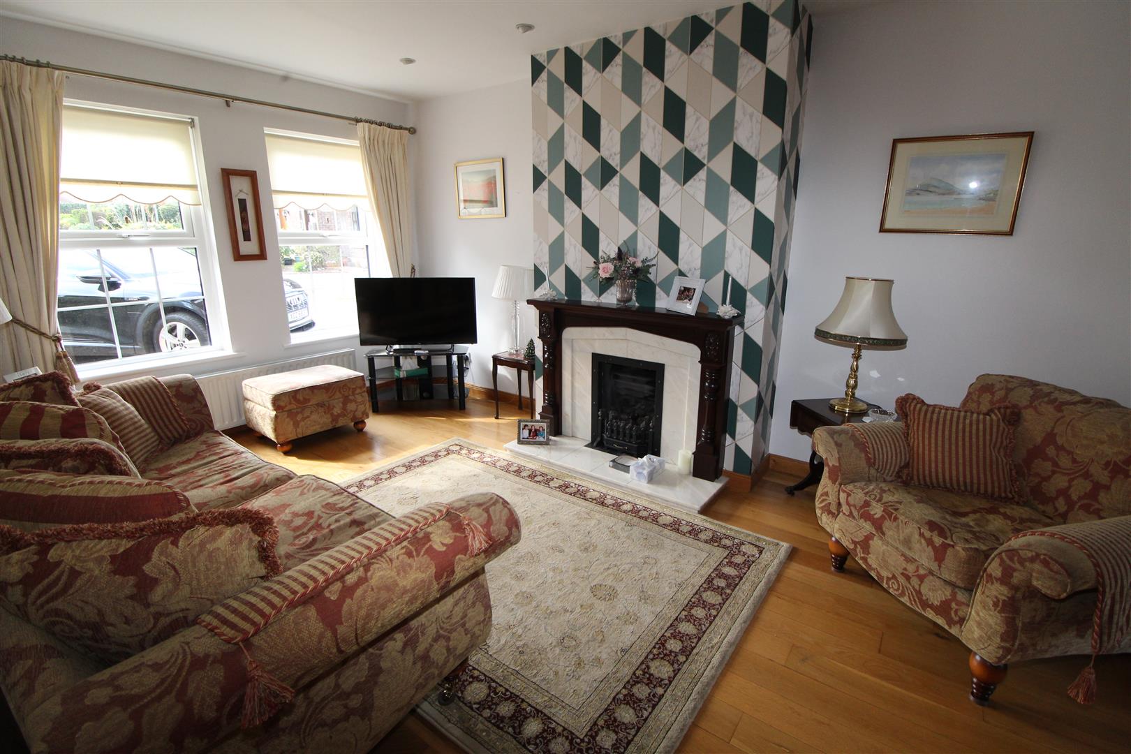 Feature marble fireplace with gas fire, polished wood flooring