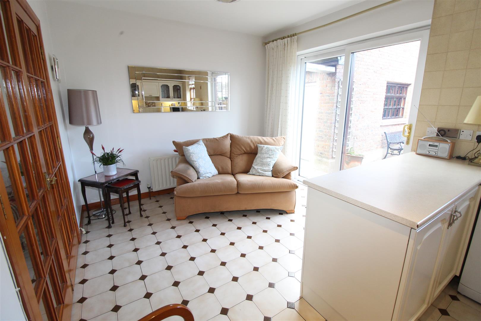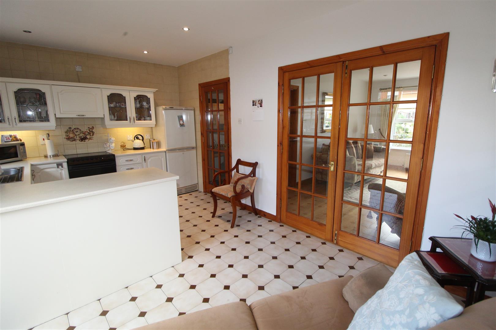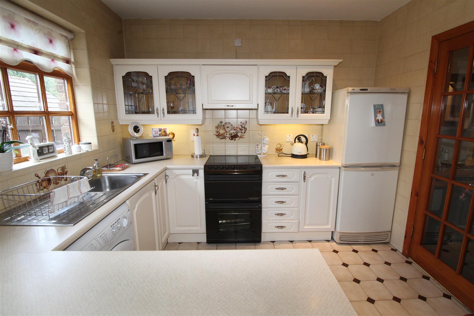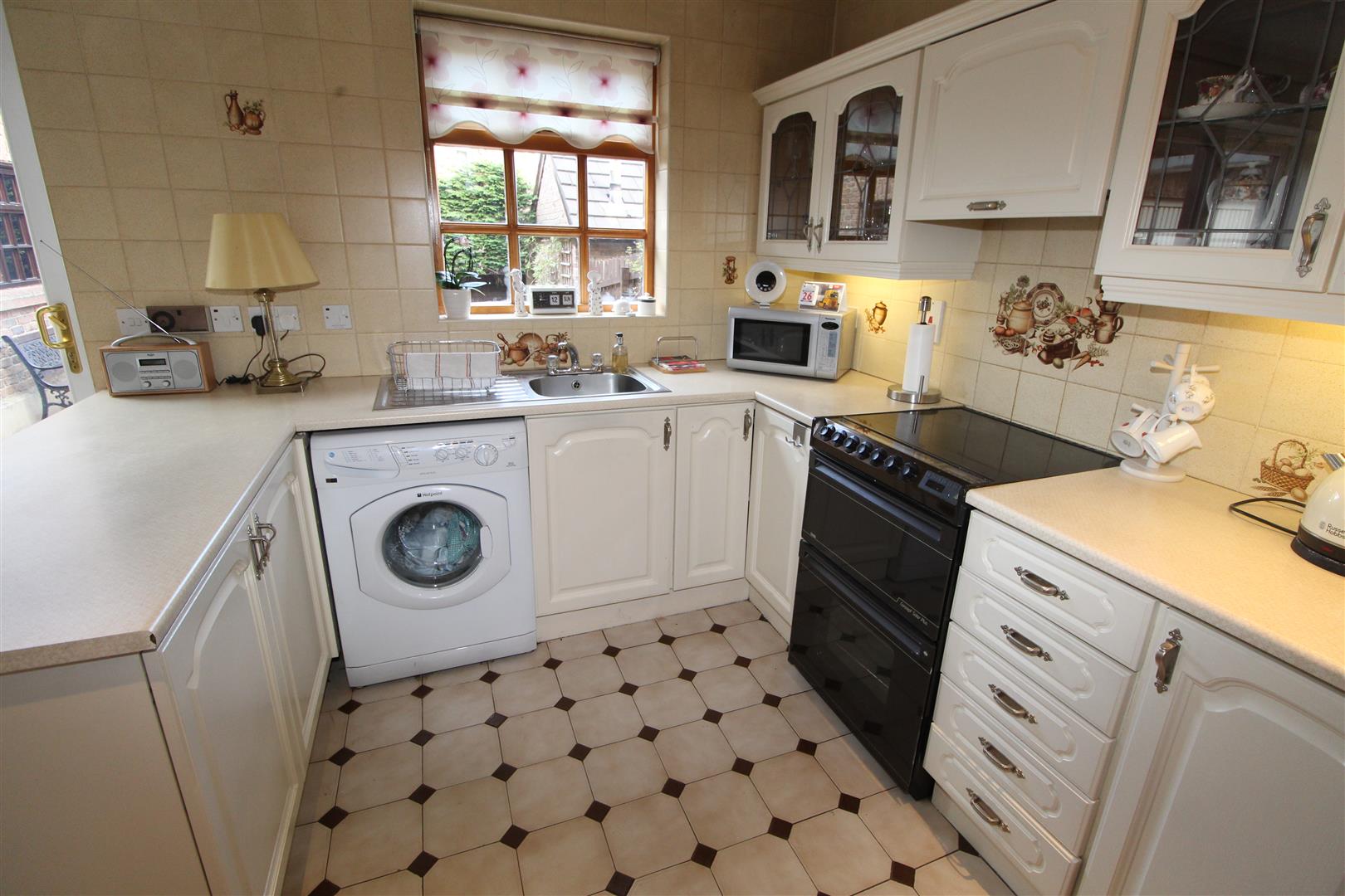 Range of built in units, round edge worksurfaces, single drainer stainless steel sink unit with mixer tap, display units, plumbed for washing machine, ceramic tiled flooring, double glazed patio doors, ceramic tiled flooring, downlighters