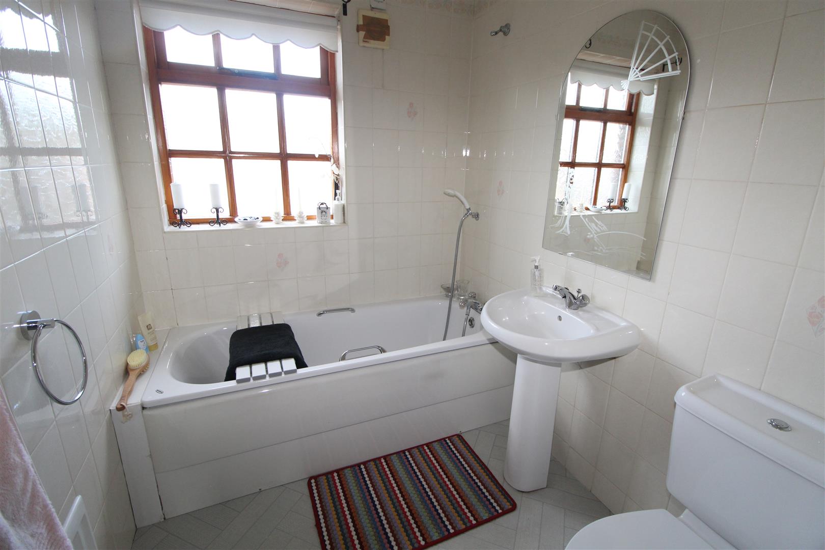 White suite panelled bath with mixer tap, telephone hand shower, low flush W/C, pedestal wash hand basin, fully tiled walls