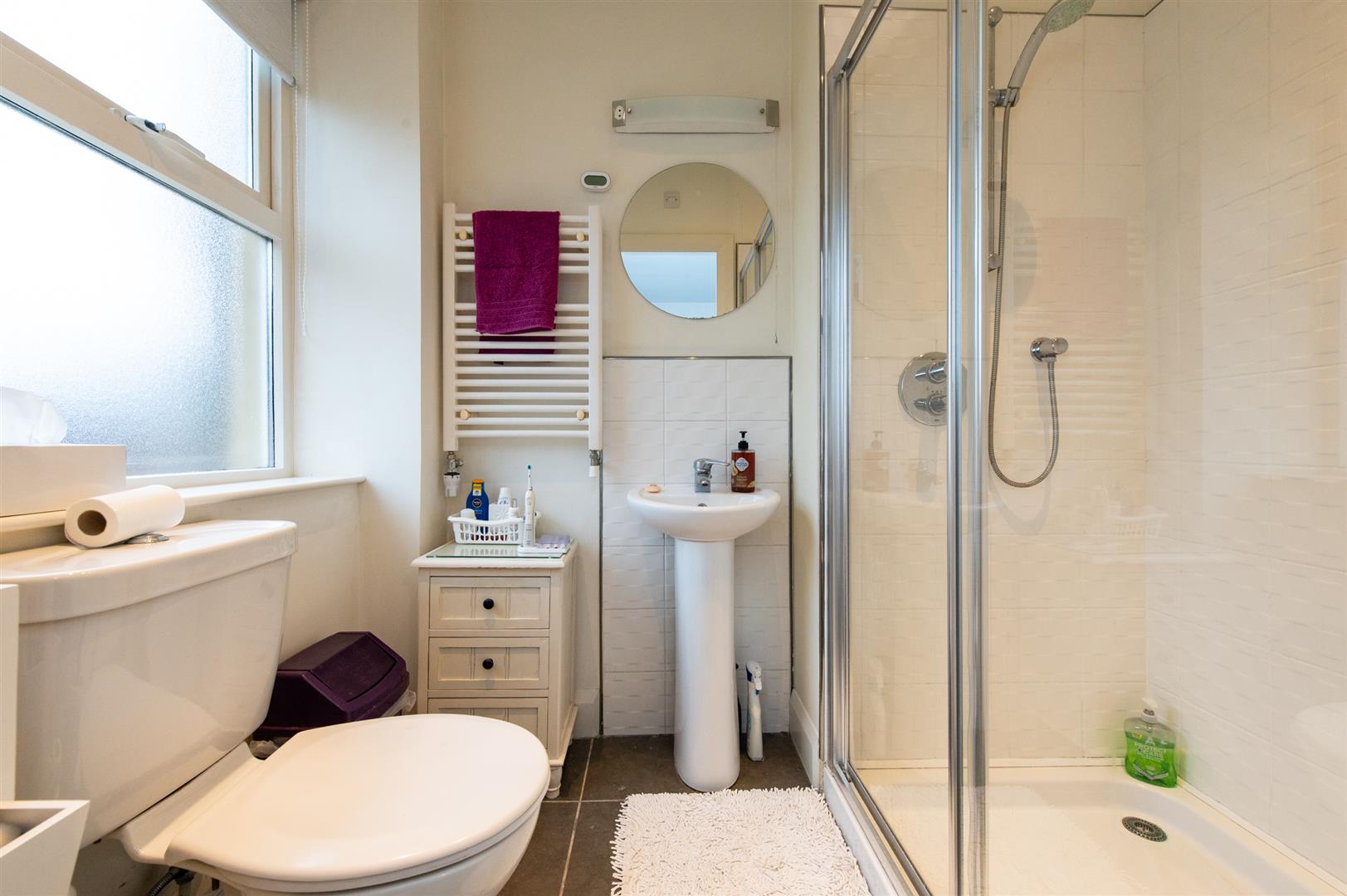 Low flush W/C, pedestal wash hand basin, glazed shower unit with controlled shower, tiling, extractor fan, downlighters, ceramic tiled flooring