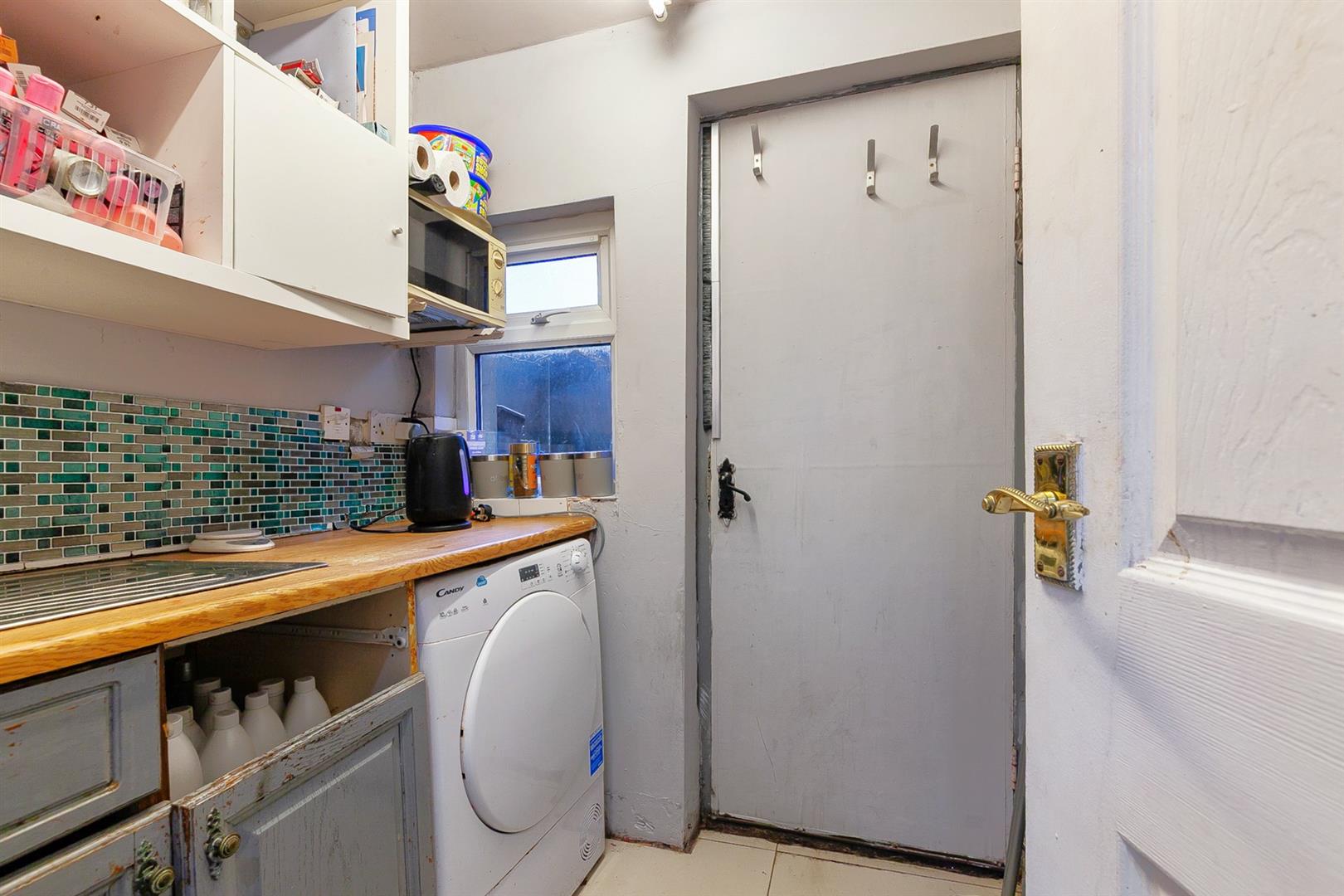 Low level storage units and contrasting melamine work surface. Stainless steel sink unit with draining bay and mixer tap over. Plumbed for automatic washing machine. Tiled floor. Strip lighting and power points. Rear door to enclosed yard area.