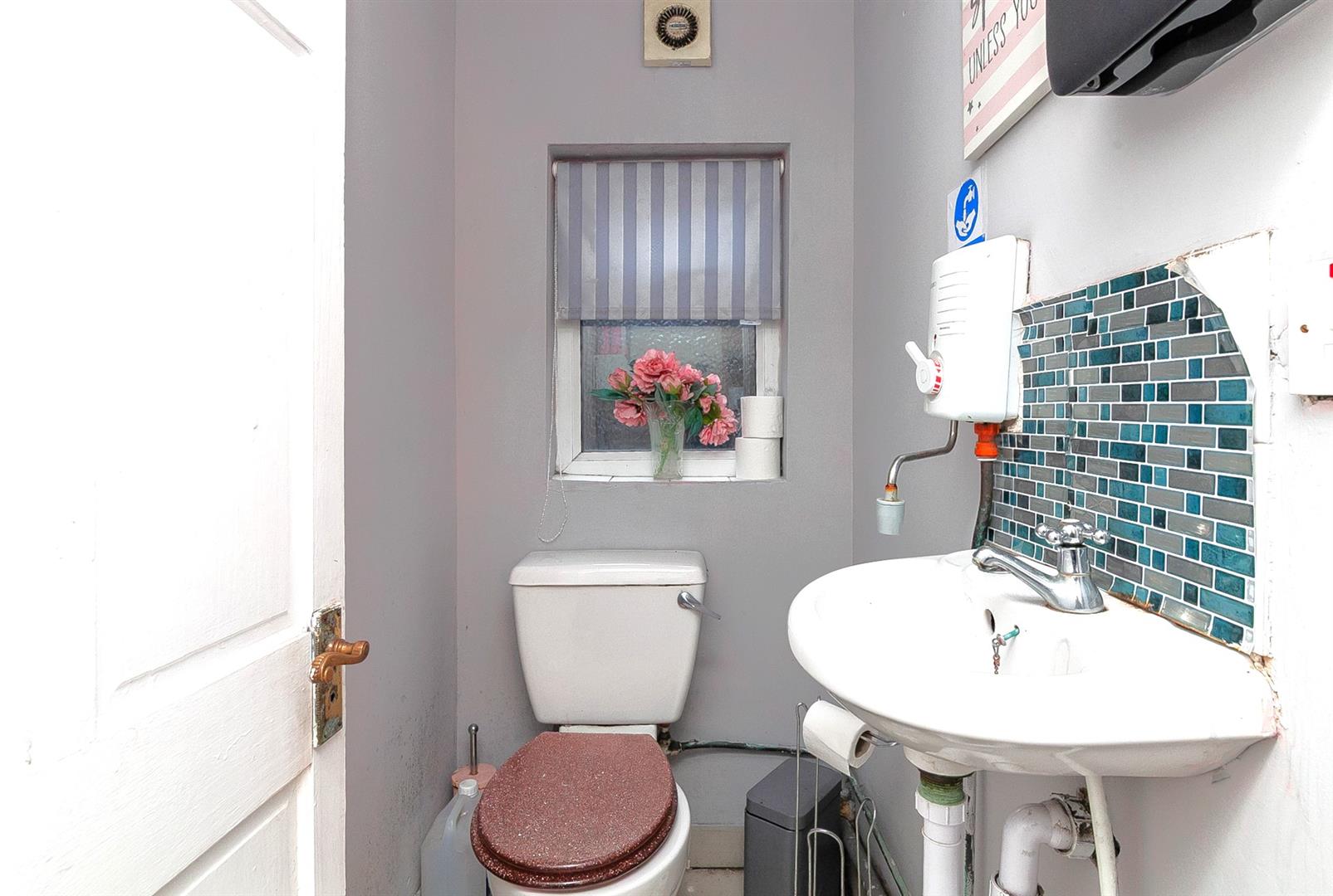 White two piece suite comprising wash hand basin and WC. Tiled floor. PVC double glazed frosted window to rear. Extractor fan. Redring hot water unit over sink.