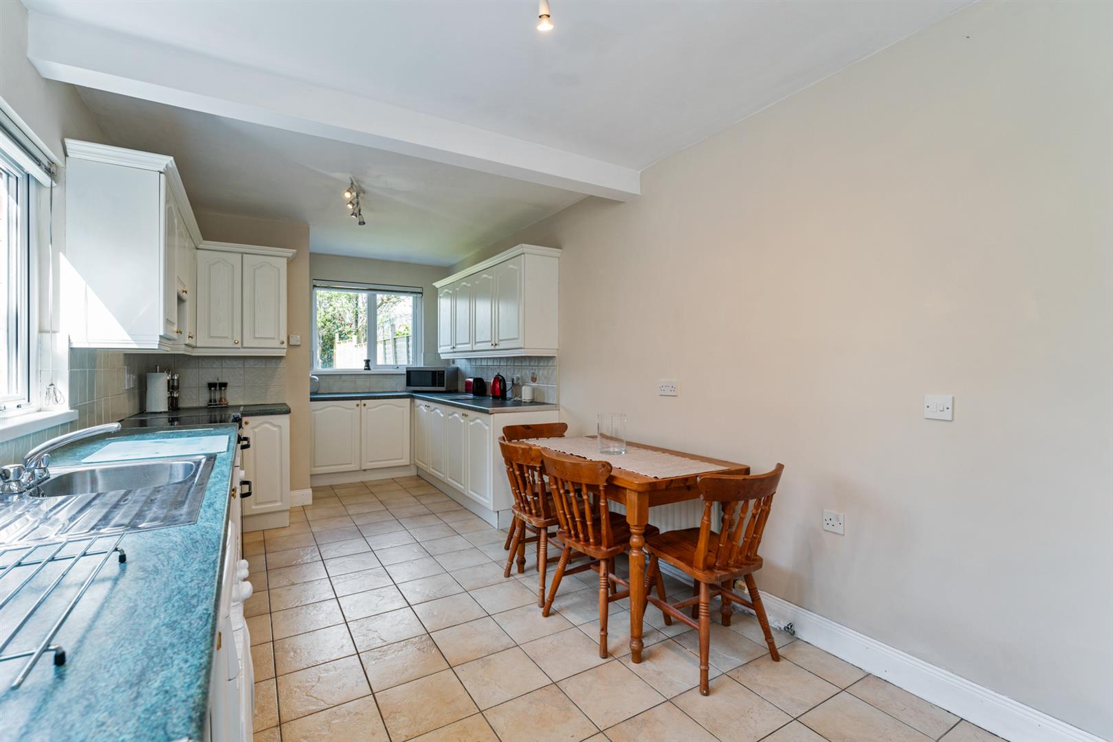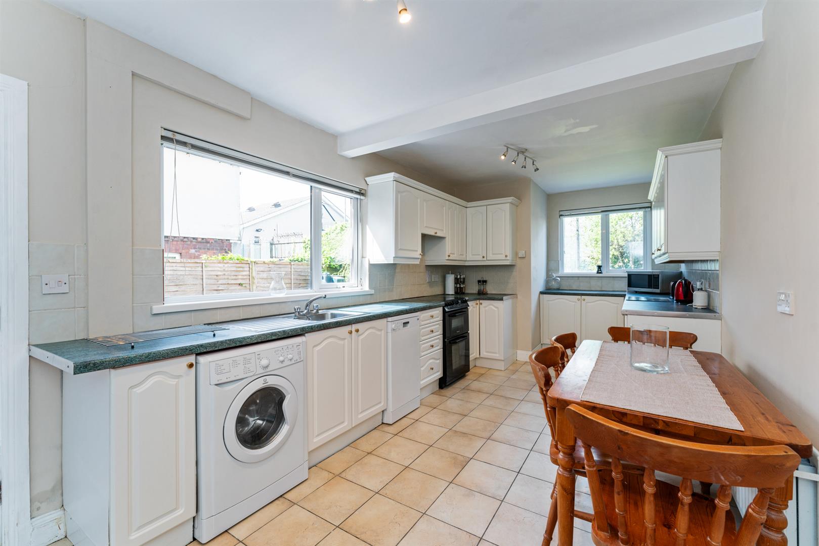 Modern fitted kitchen with range of high and low level storage units, with contrasting granite effect melamine work surface. Stainless steel sink unit with draining bay. Cooker point with extractor hood over. Plumbed and space for American style fridge freezer, washing machine and dishwasher. Splashback tiling to walls. Tiled floor. Access to under stairs store. Hardwood, glass panelled door leading to rear garden.