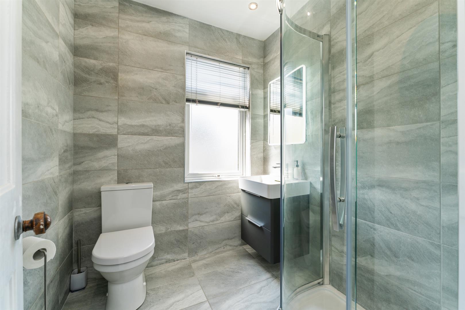 Contemporary, white, three piece suite comprising shower enclosure, floating vanity unit and WC. Thermostat controlled mains shower with drench shower head over. Illuminated mirror over sink. Towel radiator.
