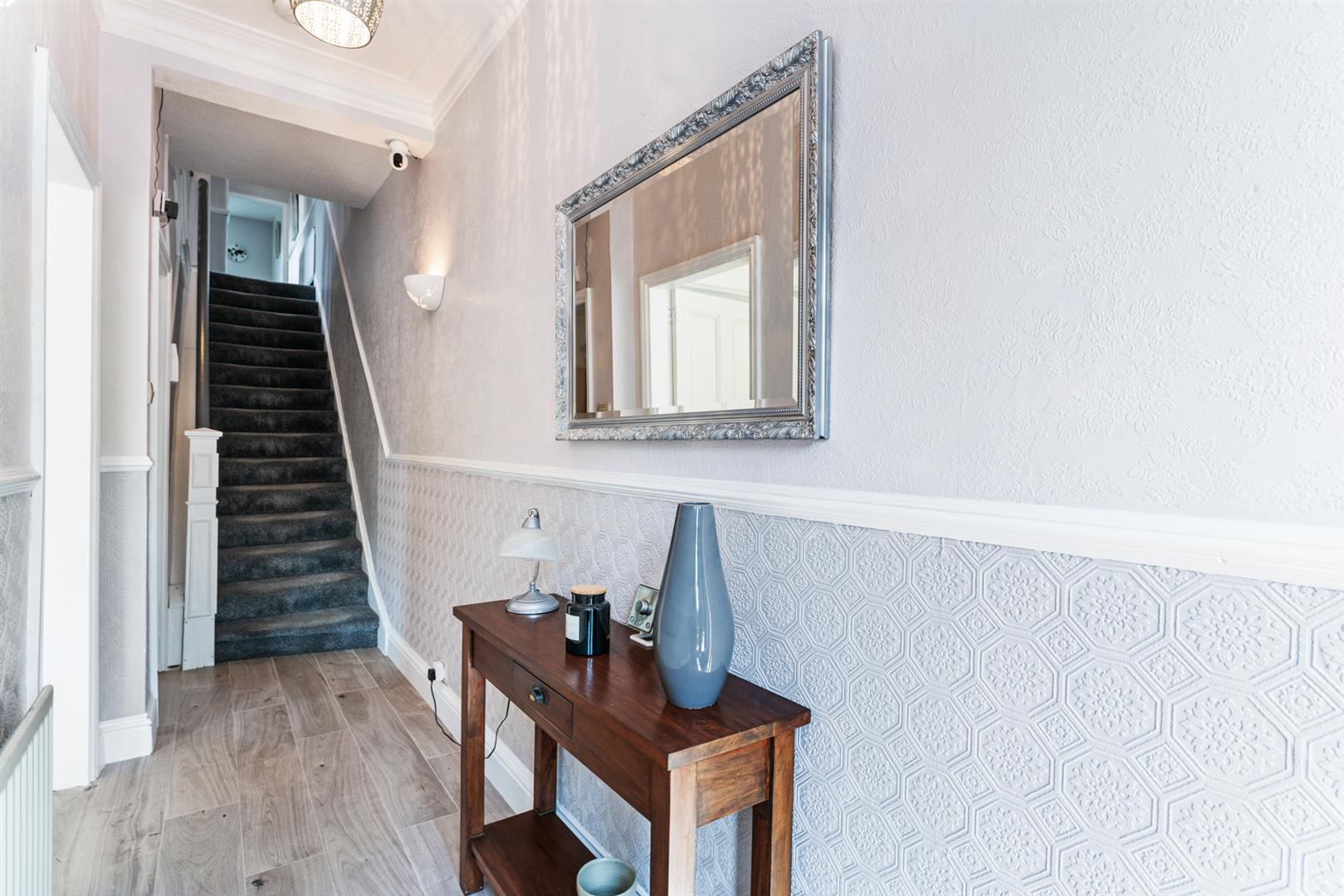 Hardwood, glass panelled front door. Wood laminate floor covering. Feature height ceiling. Coving to ceiling. Stairwell to first floor.