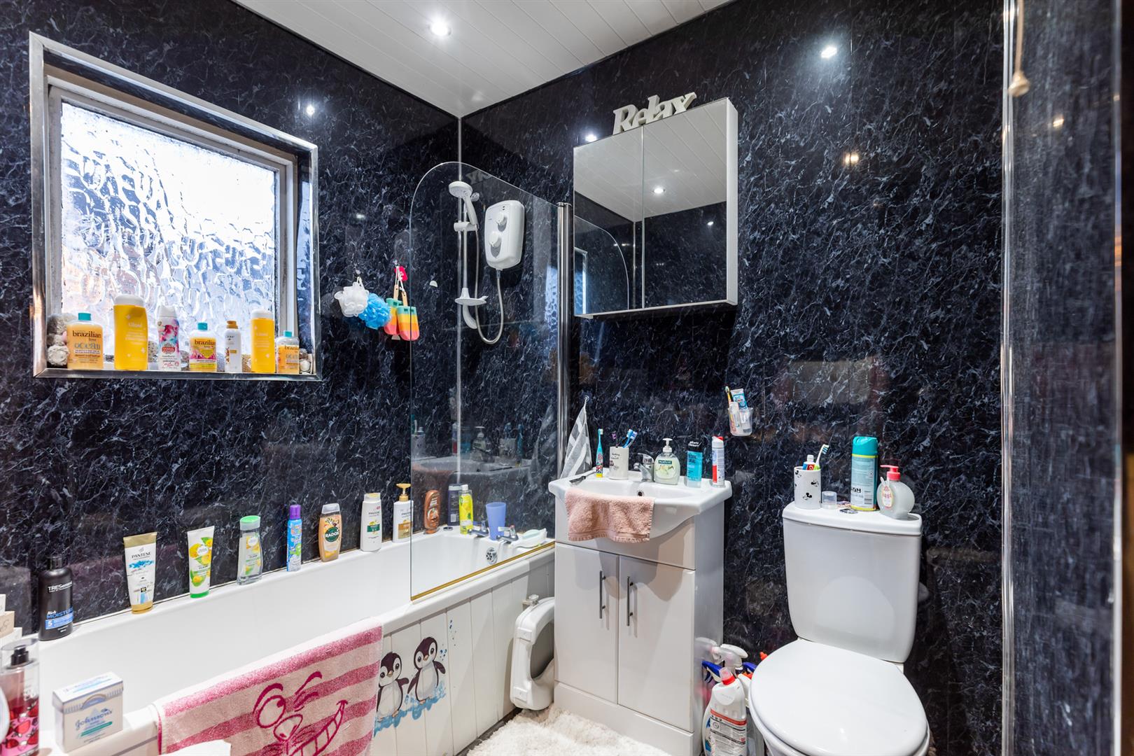 White three piece suite comprising panelled bath, vanity unit and WC. Electric shower and glass shower screen over bath. Fully panelled walls. Chrome towel radiator. Access to roof space.