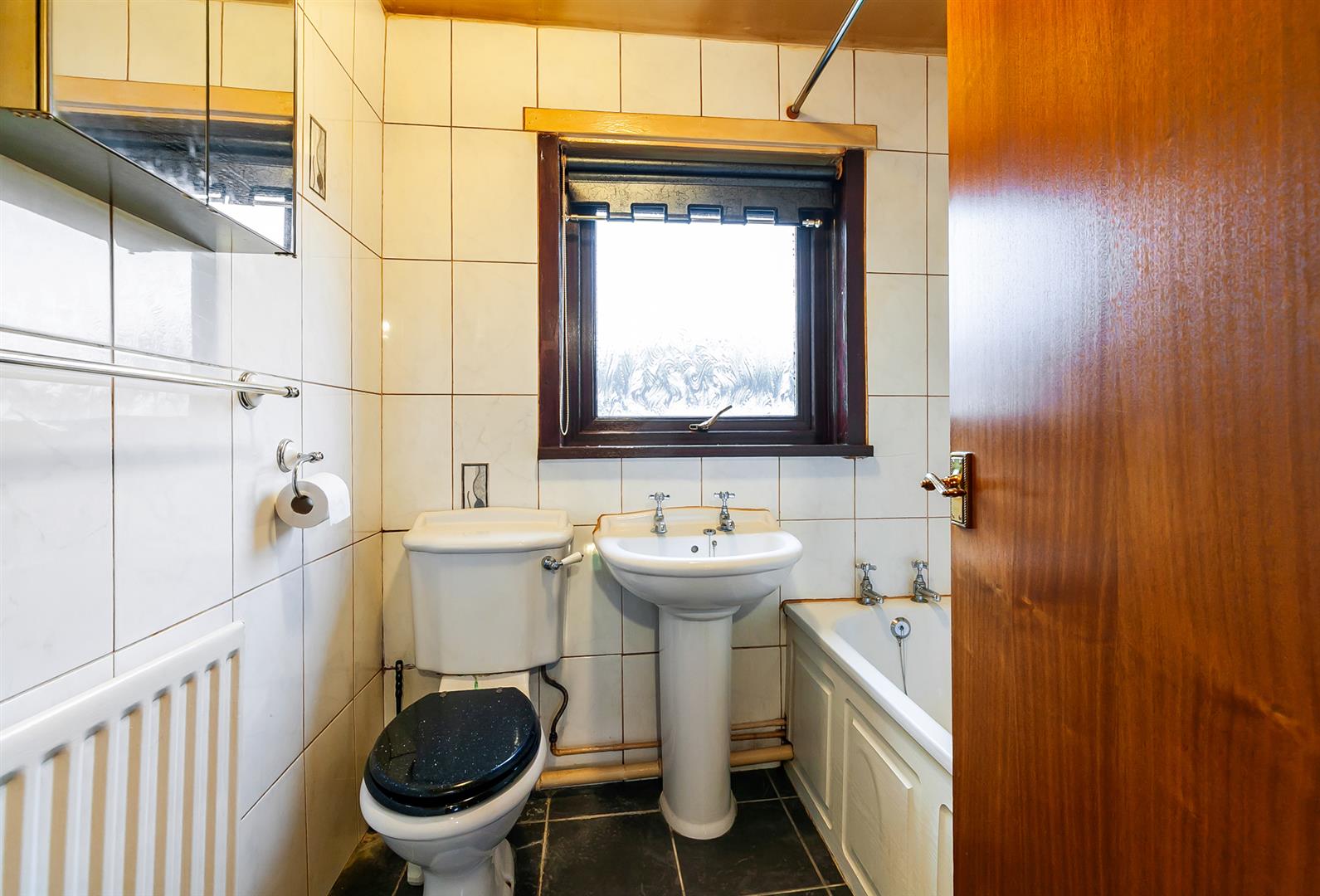White, three piece suite comprising panelled bath, pedestal wash hand basin and WC. Electric shower over bath. Fully tiled bath.