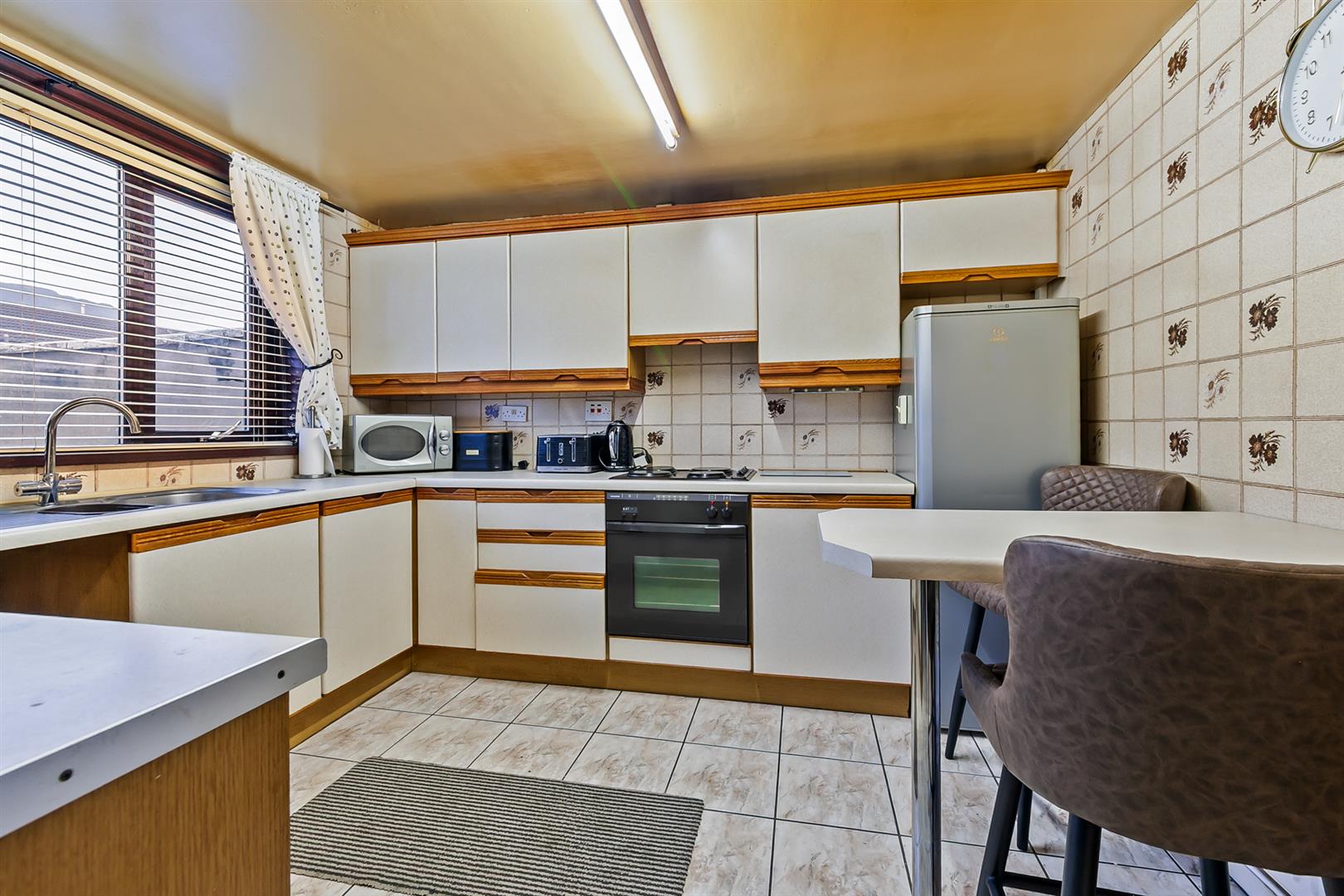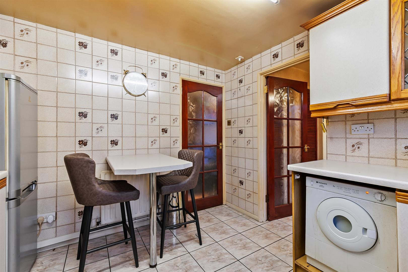 Fitted kitchen with range of high and low level storage units with contrasting melamine work surface. Stainless steel 1.5 bowl sink unit with draining bay. Integrated hob with extractor hood over. Integrated oven. Space for fridge freezer. Plumbed and space for washing machine. Space for tumble dryer. Glass fronted display cabinets. Splashback tiling to walls. Tiled floor. Fitted breakfast bar unit. Glass panelled door leading to: