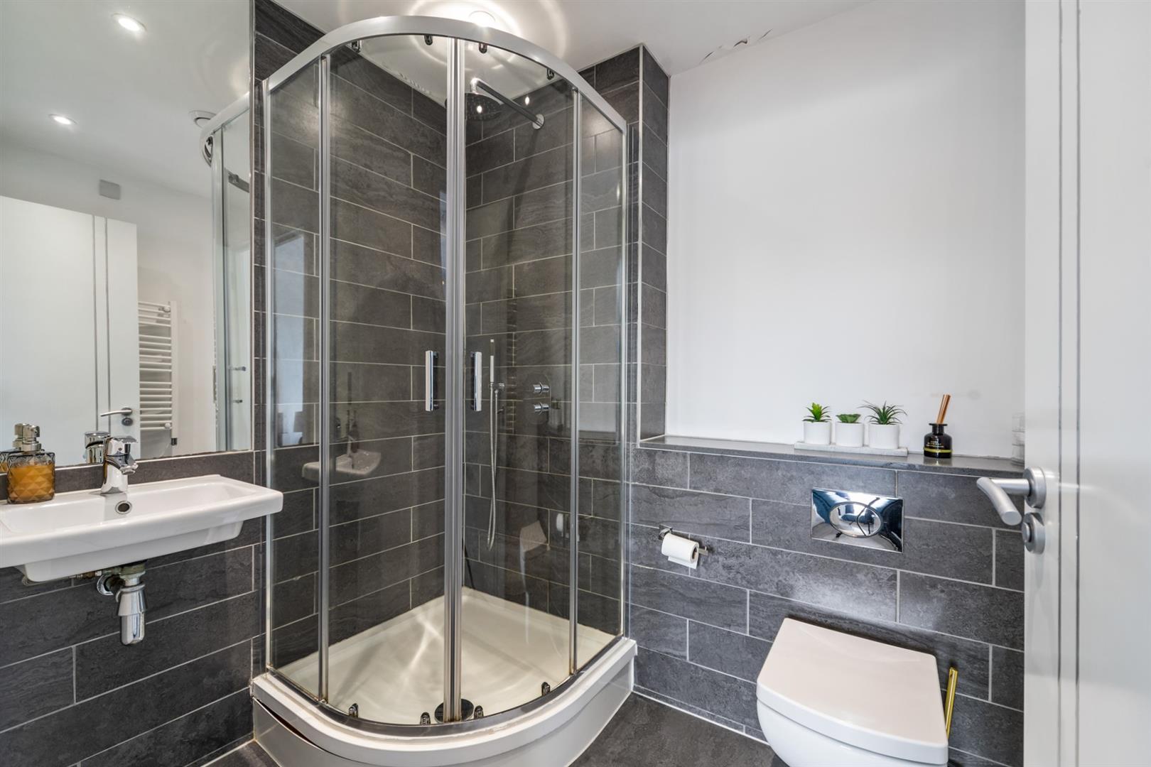 Contemporary, white, three piece suite comprising fully tiled shower enclosure, wash hand basin and concealed cistern WC. Thermostat controlled mains shower unit with drench shower head. Towel radiator. Part tiling to walls. Tiled floor.