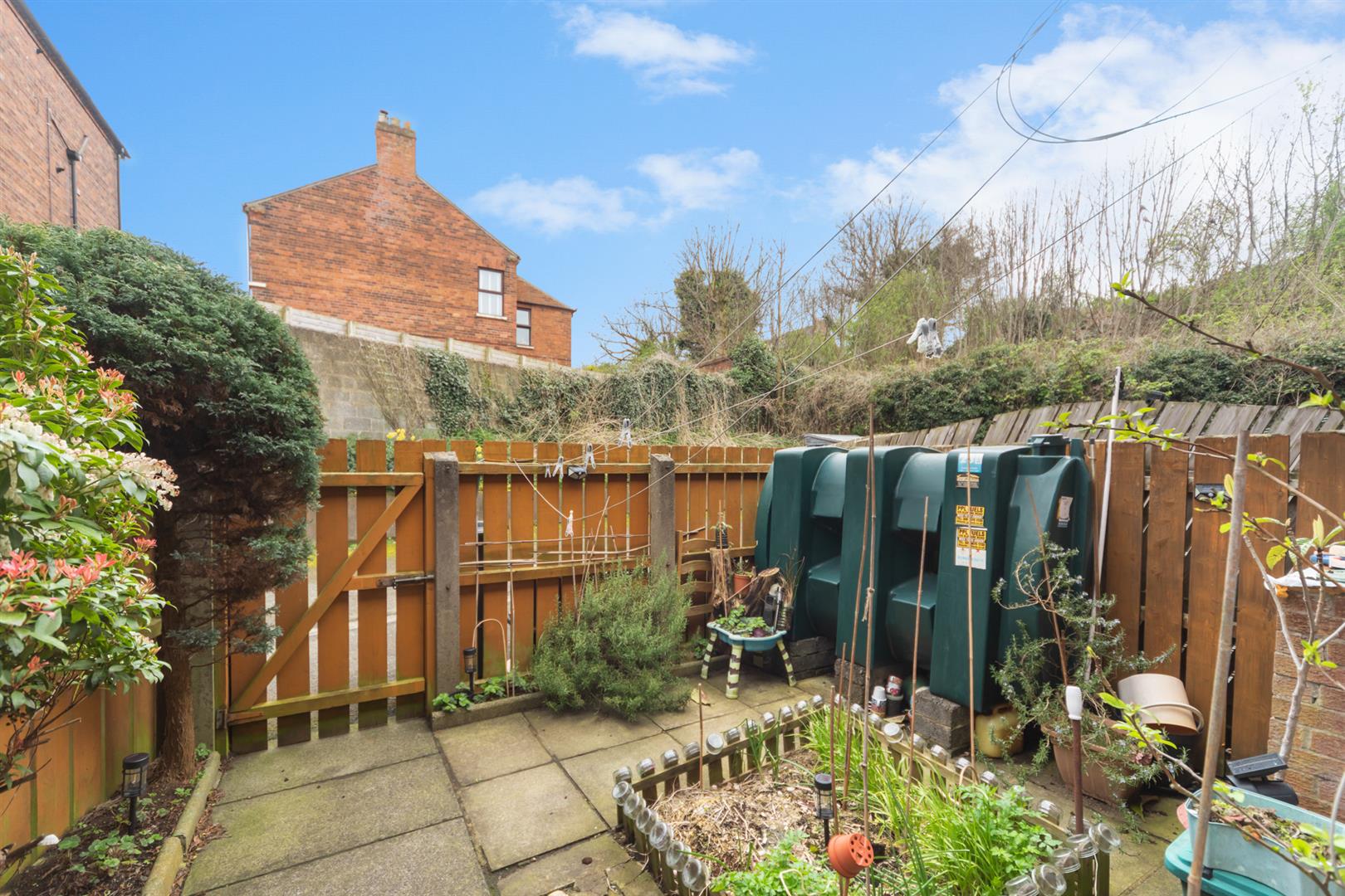 Fully enclosed, low maintenance rear garden finished in paving and shrub beds.