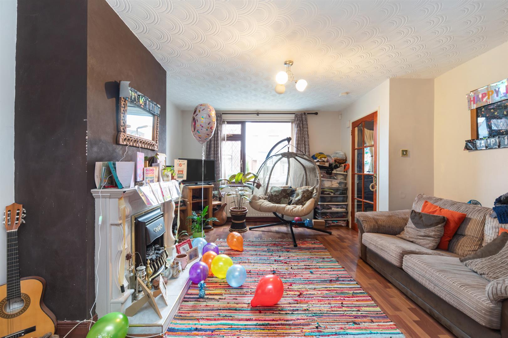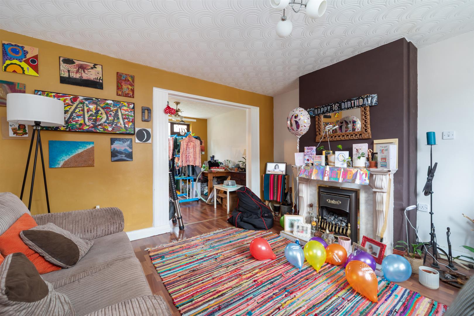 Wood laminate floor covering. PVC double glazed picture window to front elevation. Focal point, decorative fireplace with electric fire inset. Open arch into: