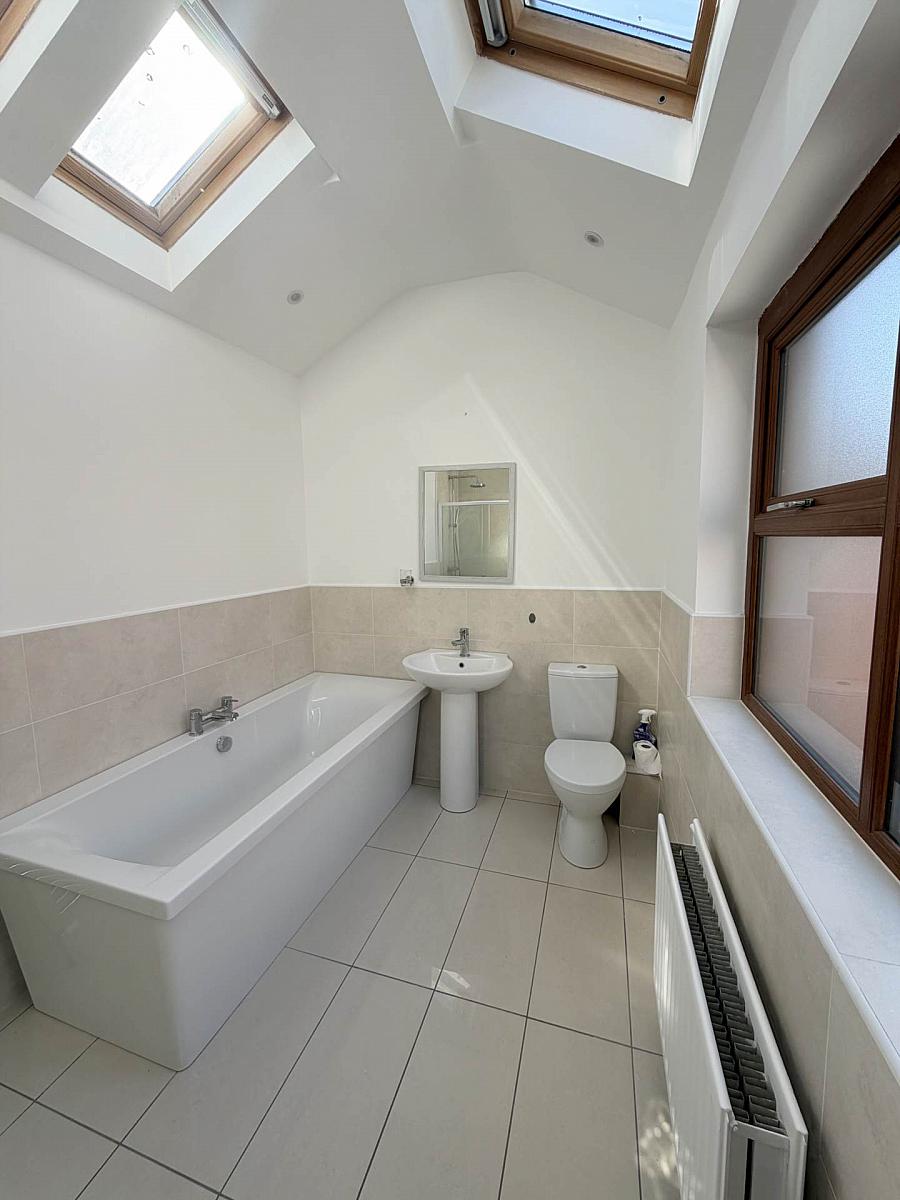 Large shower cubicle with thermostatic shower and rainfall shower head, bath with side mounted taps, wash had basin, W.C., porcelain tiled floor, part tiled walls, chrome towel radiator, spotlights and four Velux type windows in pitched roof