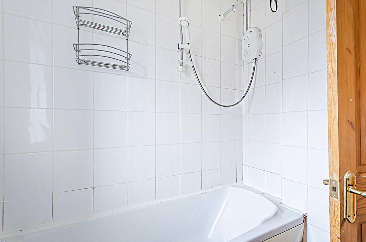 White suite with telephone taps and electric shower over bath, wash hand basin, WC, part tiled walls, part timber panelled walls and timber panelled ceiling