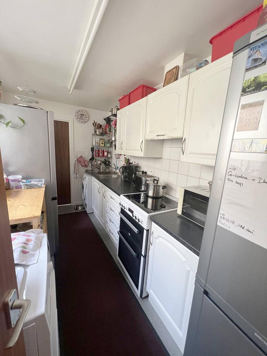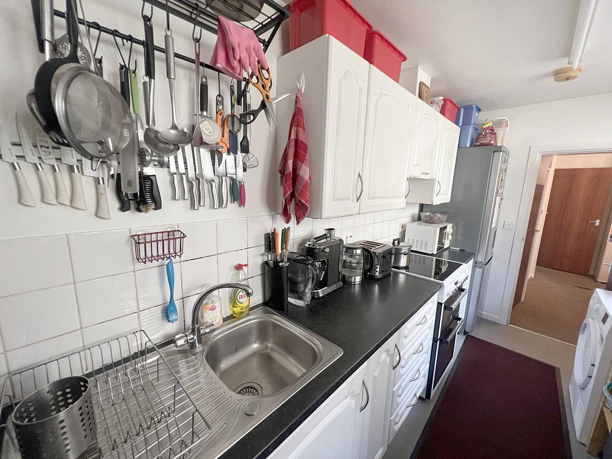 Range of high and low level fitted units, concealed extractor fan, part tiled walls and plumbing for washing machine