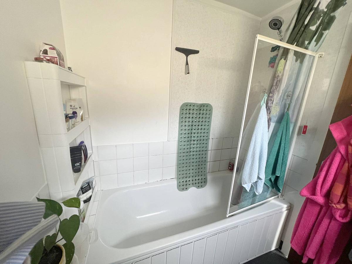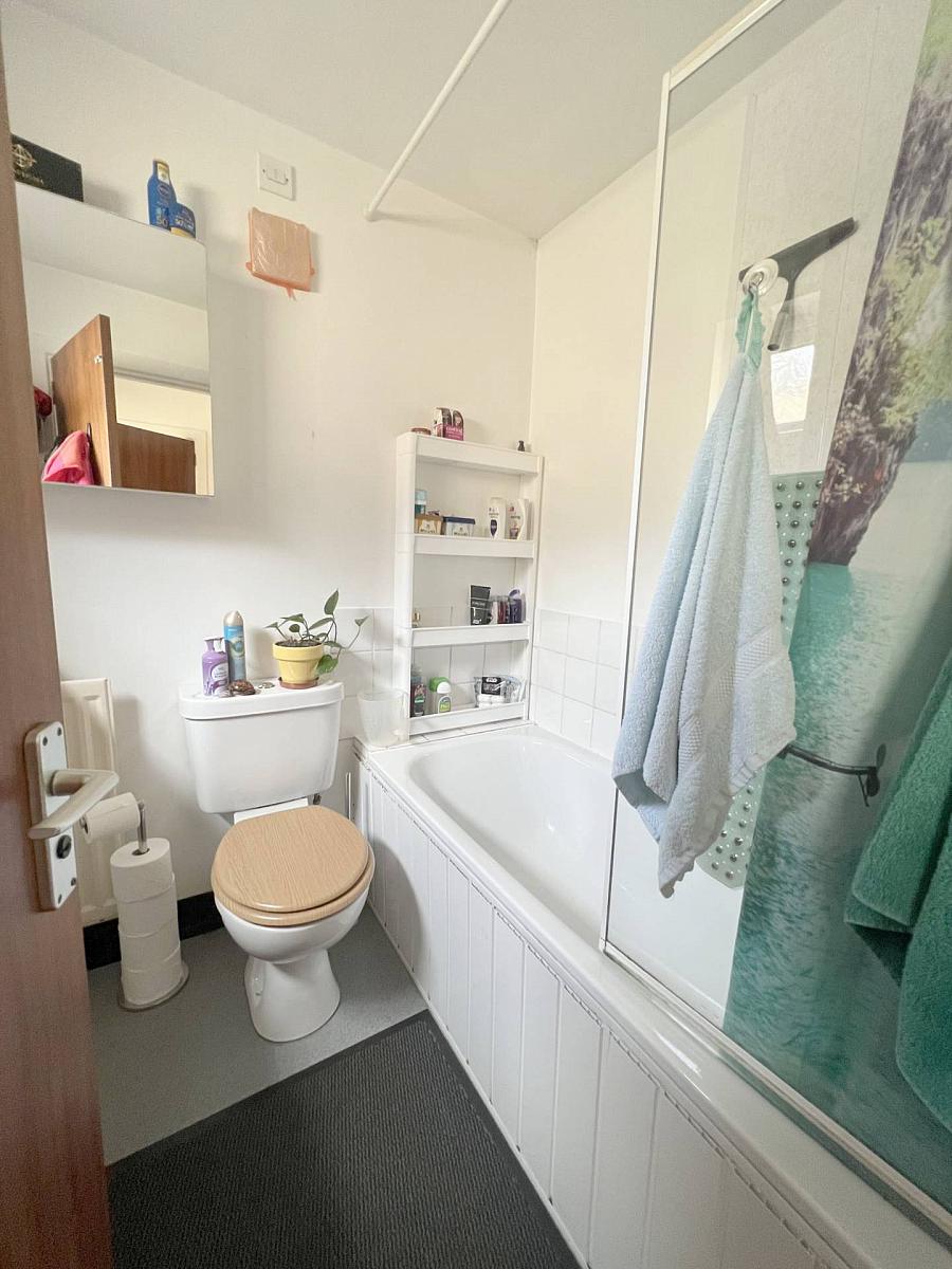 White suite with shower attachment and screen over bath, wash hand basin, W.C., part tiled walls and part PVC panelled walls