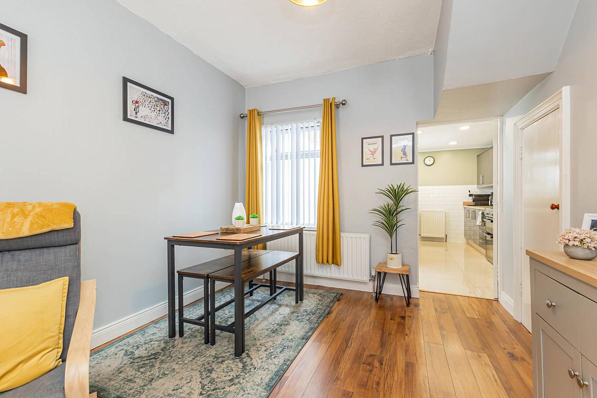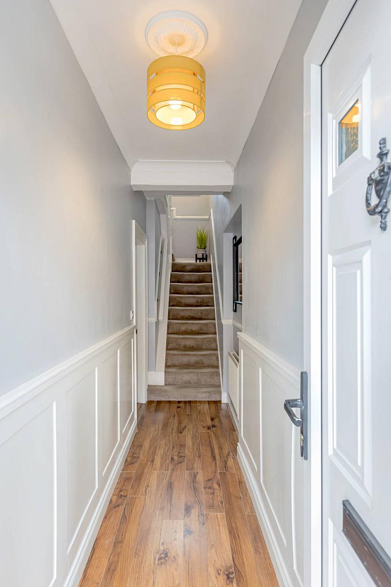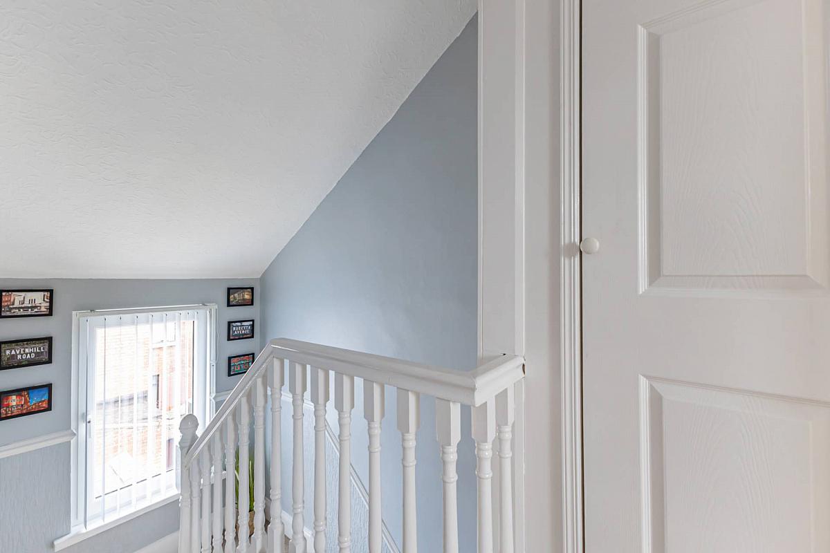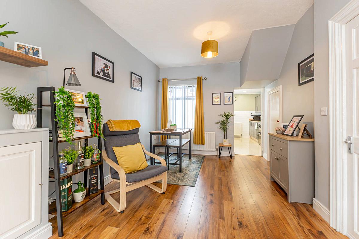 This is a beautiful three-storey terrace property located just off the Cregagh Road. An elegant hallway adorned with period-style panelling sets a warm and inviting tone. The living room also has a feature period fireplace, complemented by the neutral décor. An extended modern fitted kitchen with integrated appliances and tiled flooring, looks out over the smart, well kept yard.