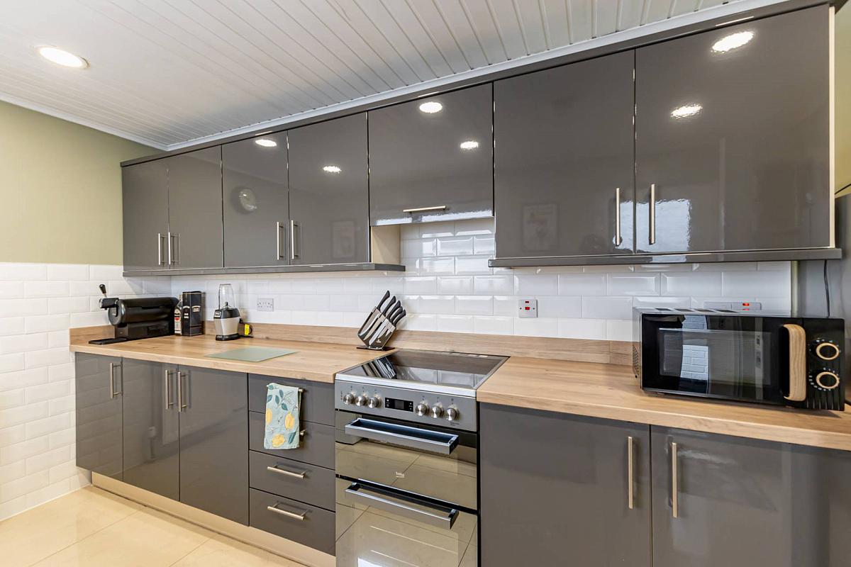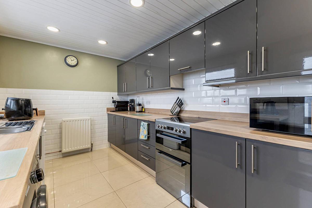 Modern range of high and low level fitted units, concealed extractor fan, part tiled walls, ceramic tiled floor, timber panelled ceiling and recessed spotlights