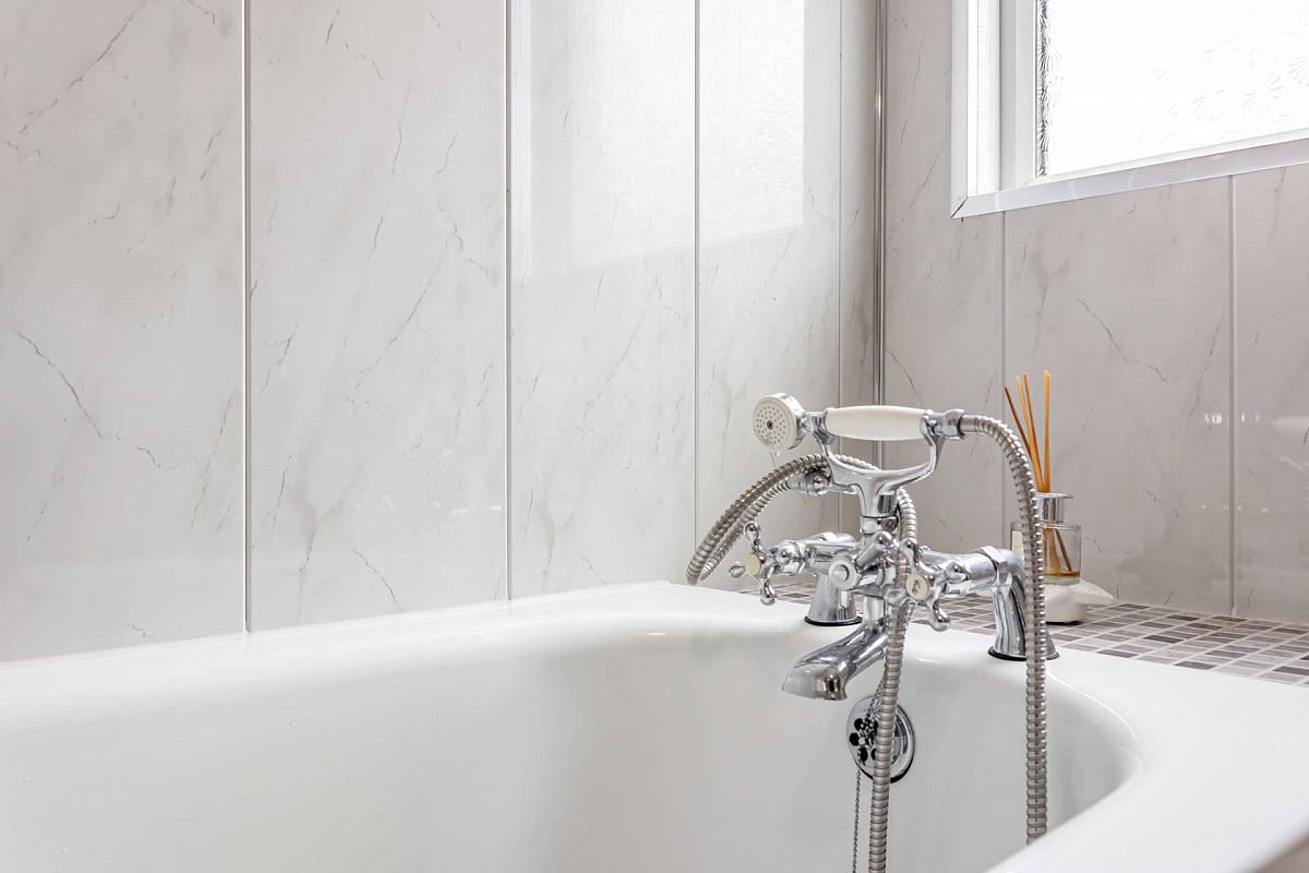 White suite, bath with telephone style taps, wash hand basin, W.C., separate shower cubicle with electric shower, part PVC panelled walls and ceramic tiled floor