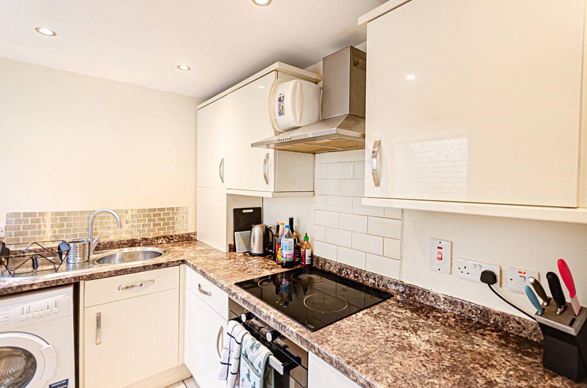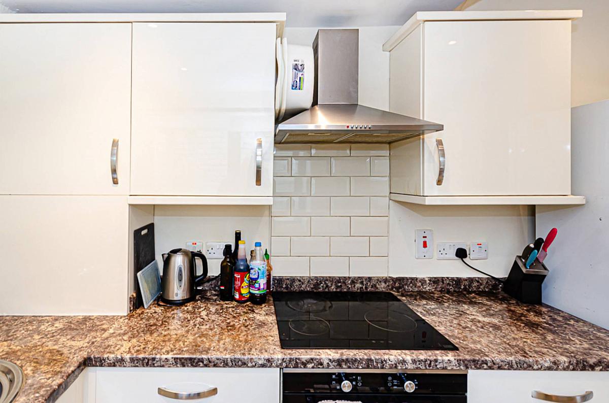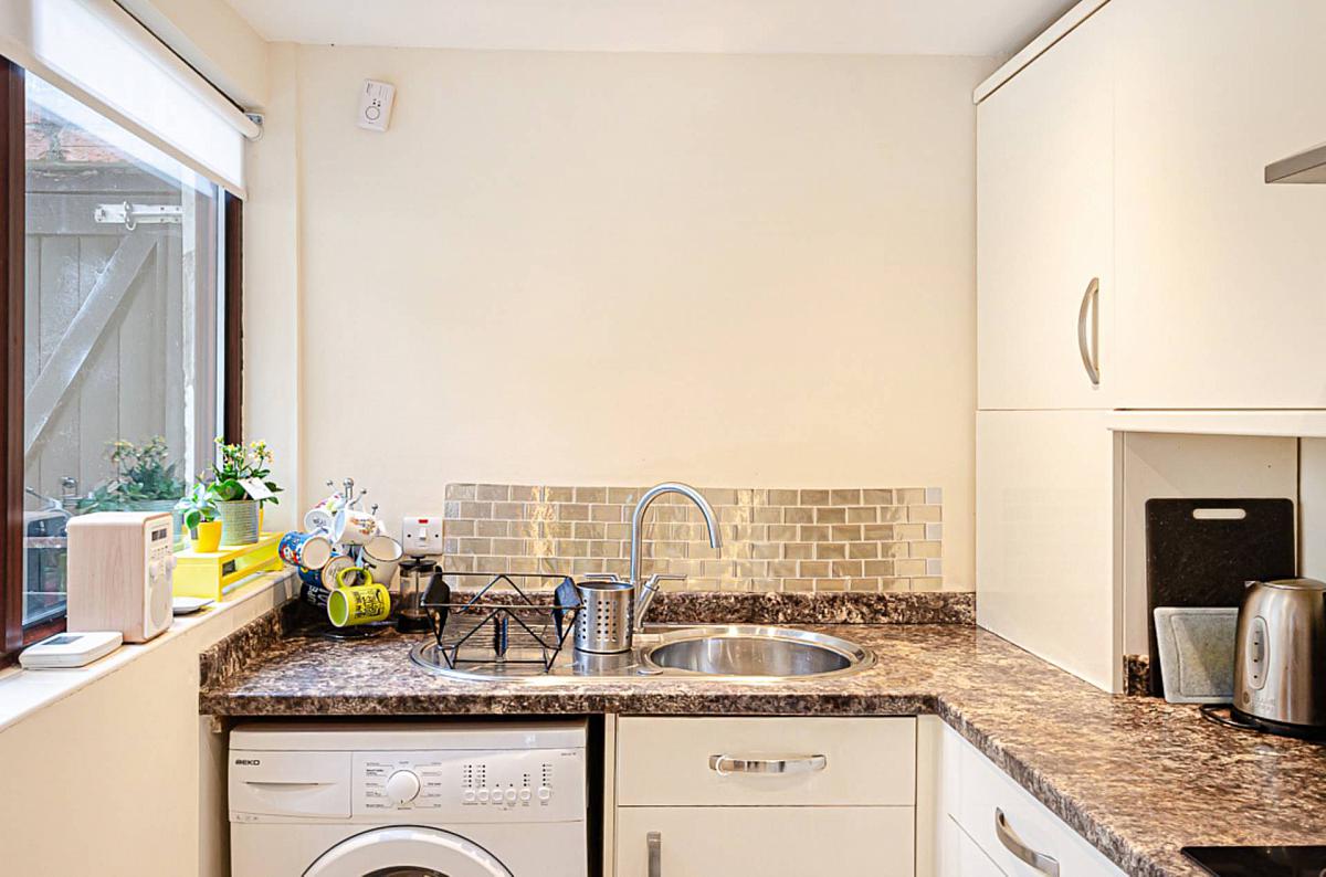 Range of high ad low level fitted units, integrated electric oven, ceramic hob, stainless steel extractor canopy, tiled splashback, ceramic tiled floor, recessed spotlights, storage under stairs and plumbing for washing machine