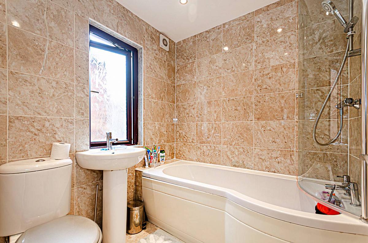 White suite - P-shaped bath with thermostatic shower and shower screen, wash hand basin, W.C., tiled walls, ceramic tiled floor, recessed spotlights and extractor fan