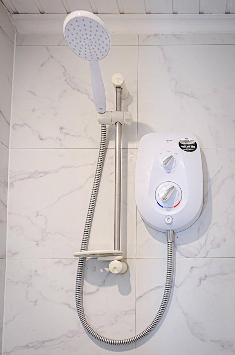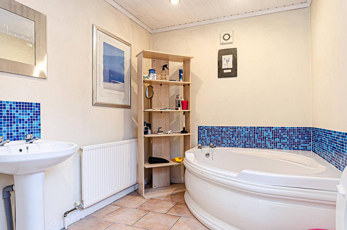 White suite - corner bath with tiled bath area, wash hand basin, W.C, separate shower cubicle with electric shower, part tiled walls, ceramic tiled floor and extractor fan