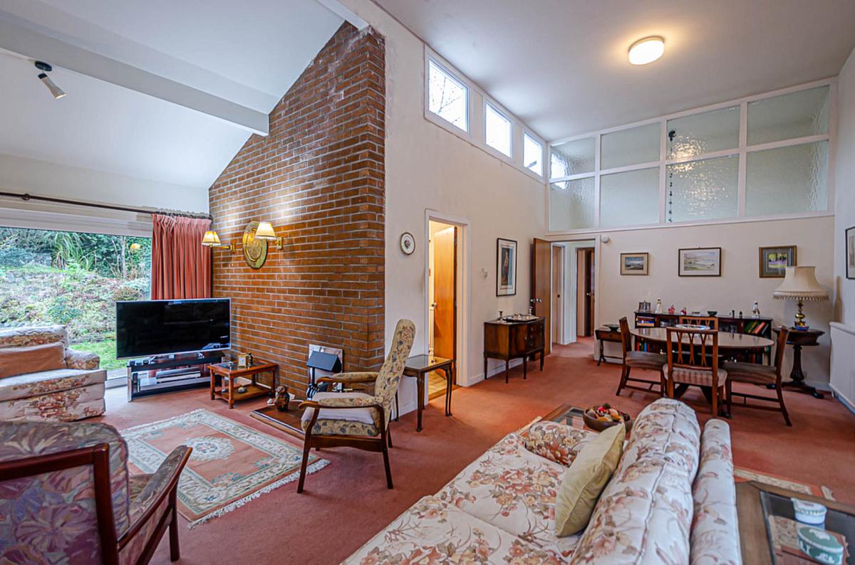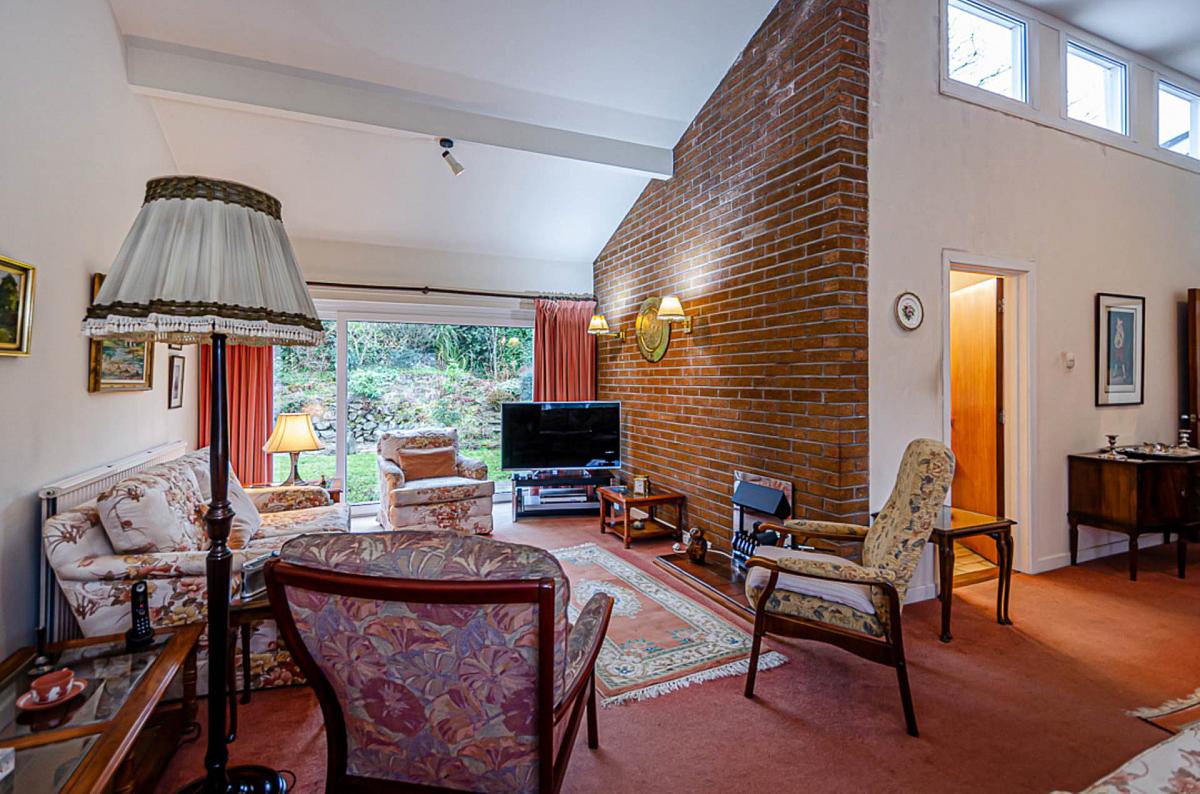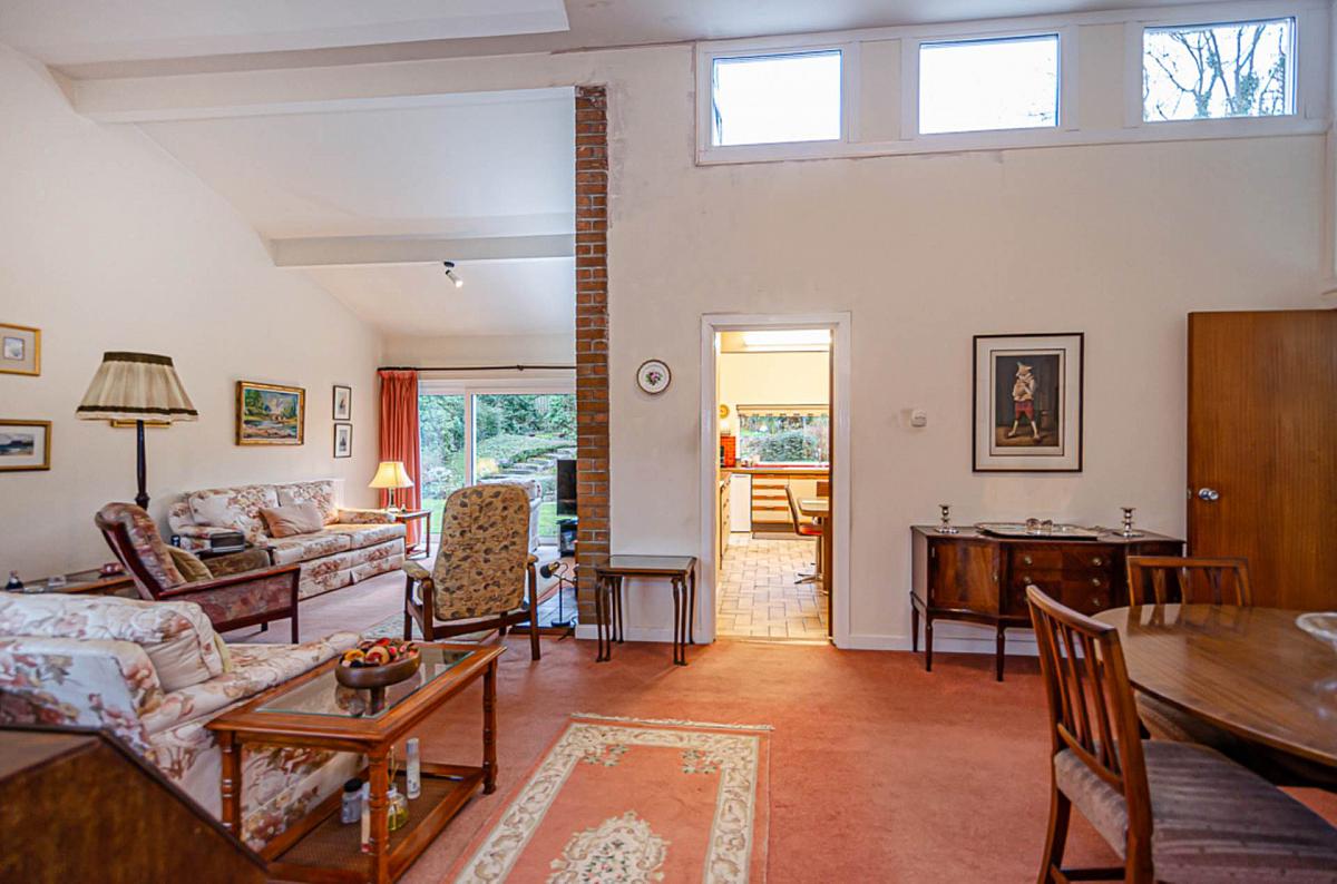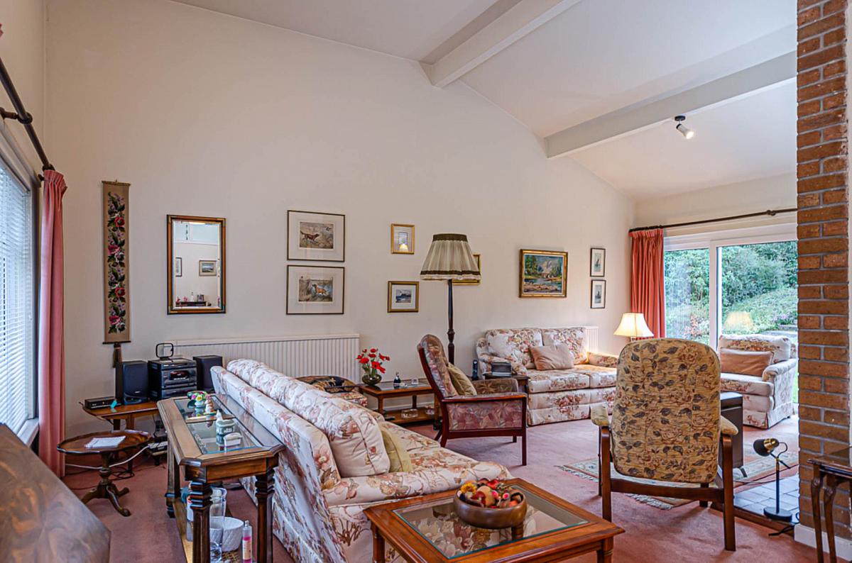 The spacious living room with vaulted ceiling is the heart of the home. Imagine unwinding here after a long day, soaking up the natural light through the large windows which offer delightful views of the garden.