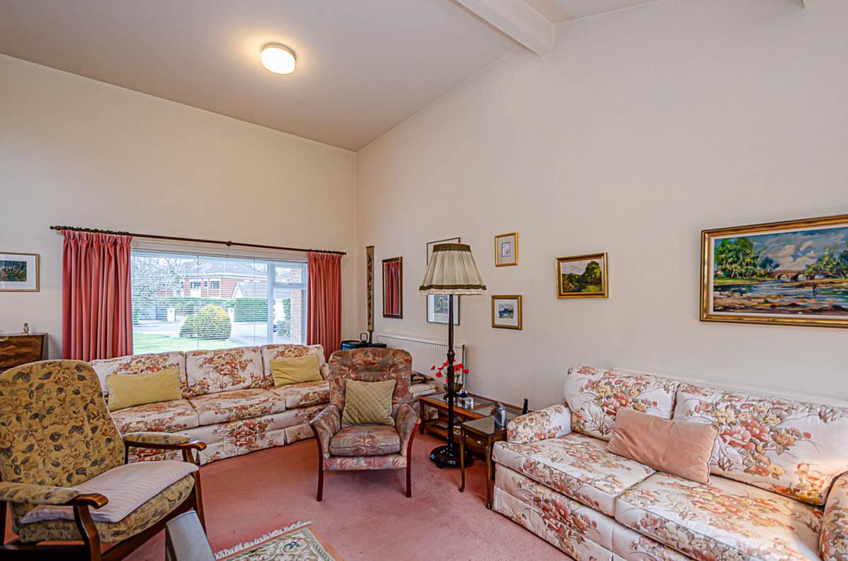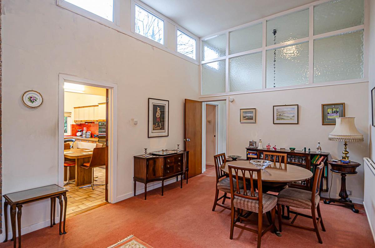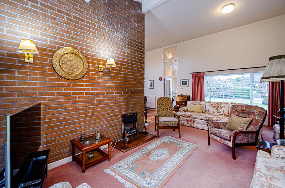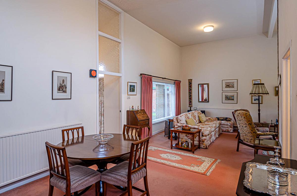 The spacious living room with vaulted ceiling is the heart of the home. Imagine unwinding here after a long day, soaking up the natural light through the large windows which offer delightful views of the garden.