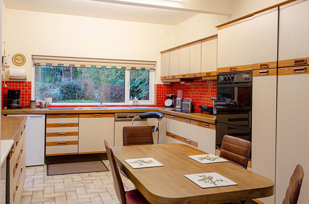 Range of fitted high and low level units, integrated oven, ceramic hob, stainless steel bowl and a half sink, part tiled walls, ceramic tiled floor and oil boiler