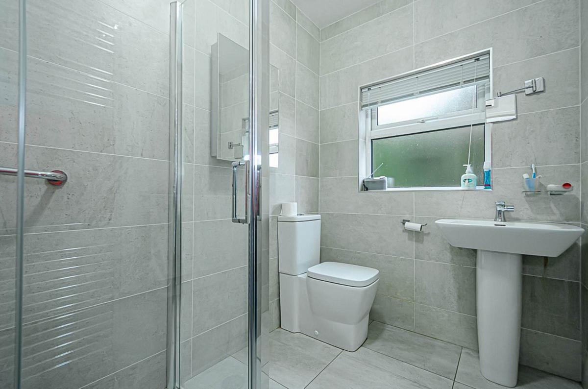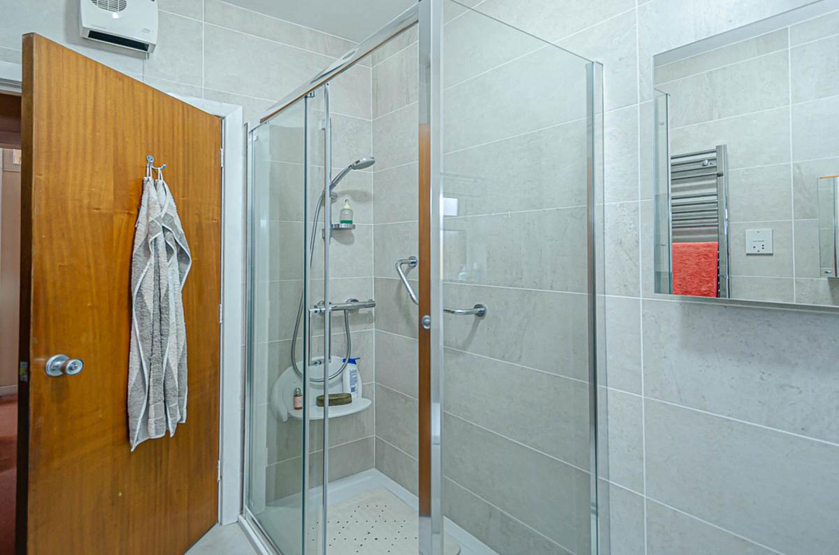 Modern shower room with large shower cubicle, thermostatic shower, wash hand basin, W.C., fully tiled walls, ceramic tiled floor, chrome towel rail radiator and mirrored bathroom cabinet