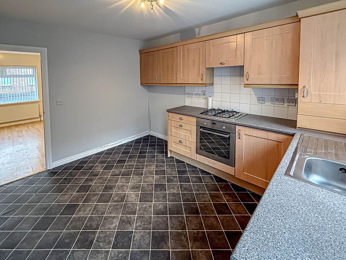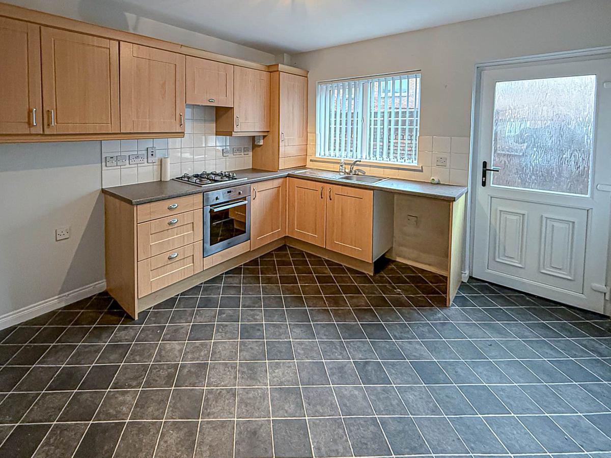 Range of high and low level fitted units, stainless steel oven, gas hob, concealed extractor fan, part tiled walls, gas boiler in cupboard, spotlights and plumbing for washing machine